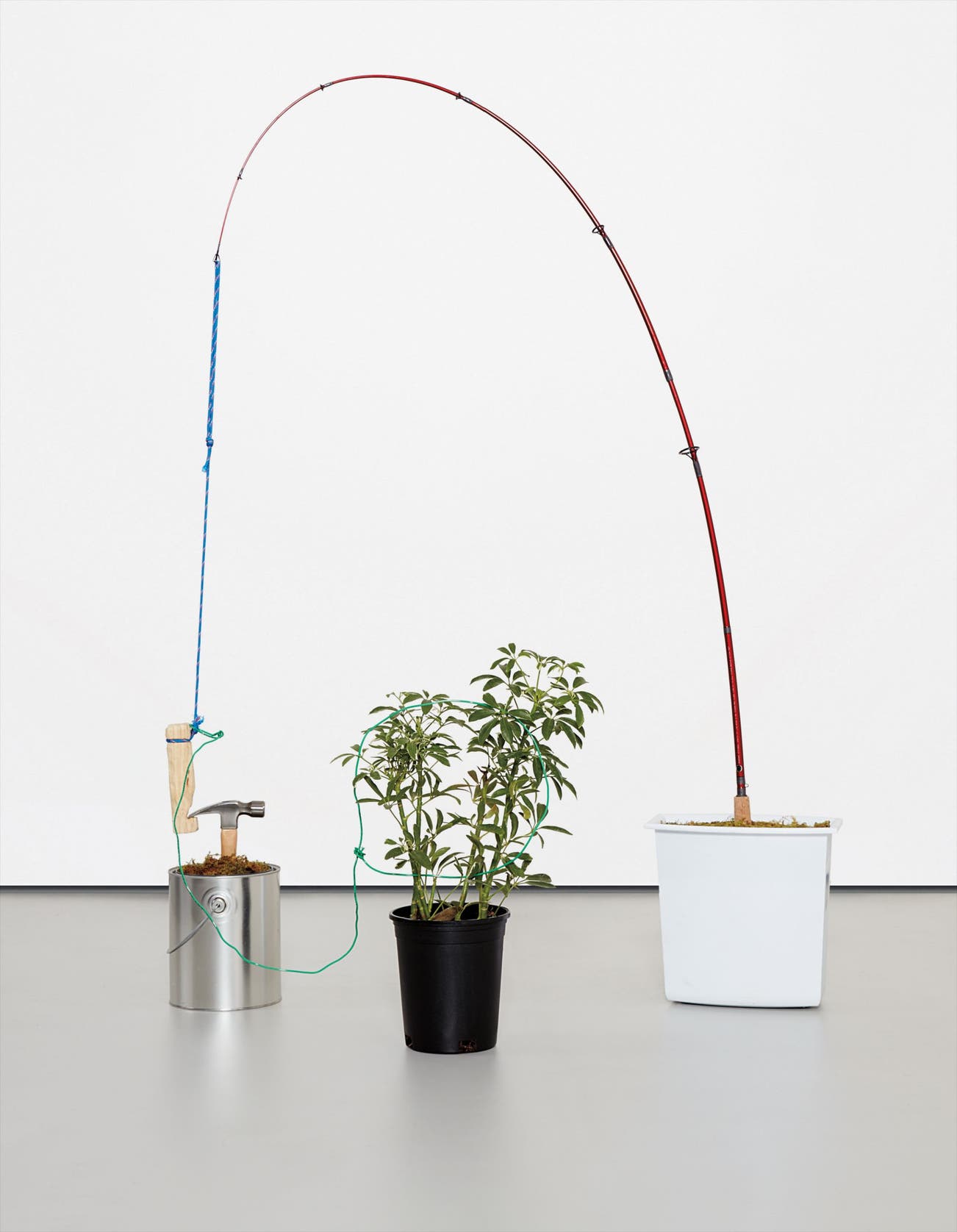 fishing rod, hammer, plant, rope, wire and moss in buckets