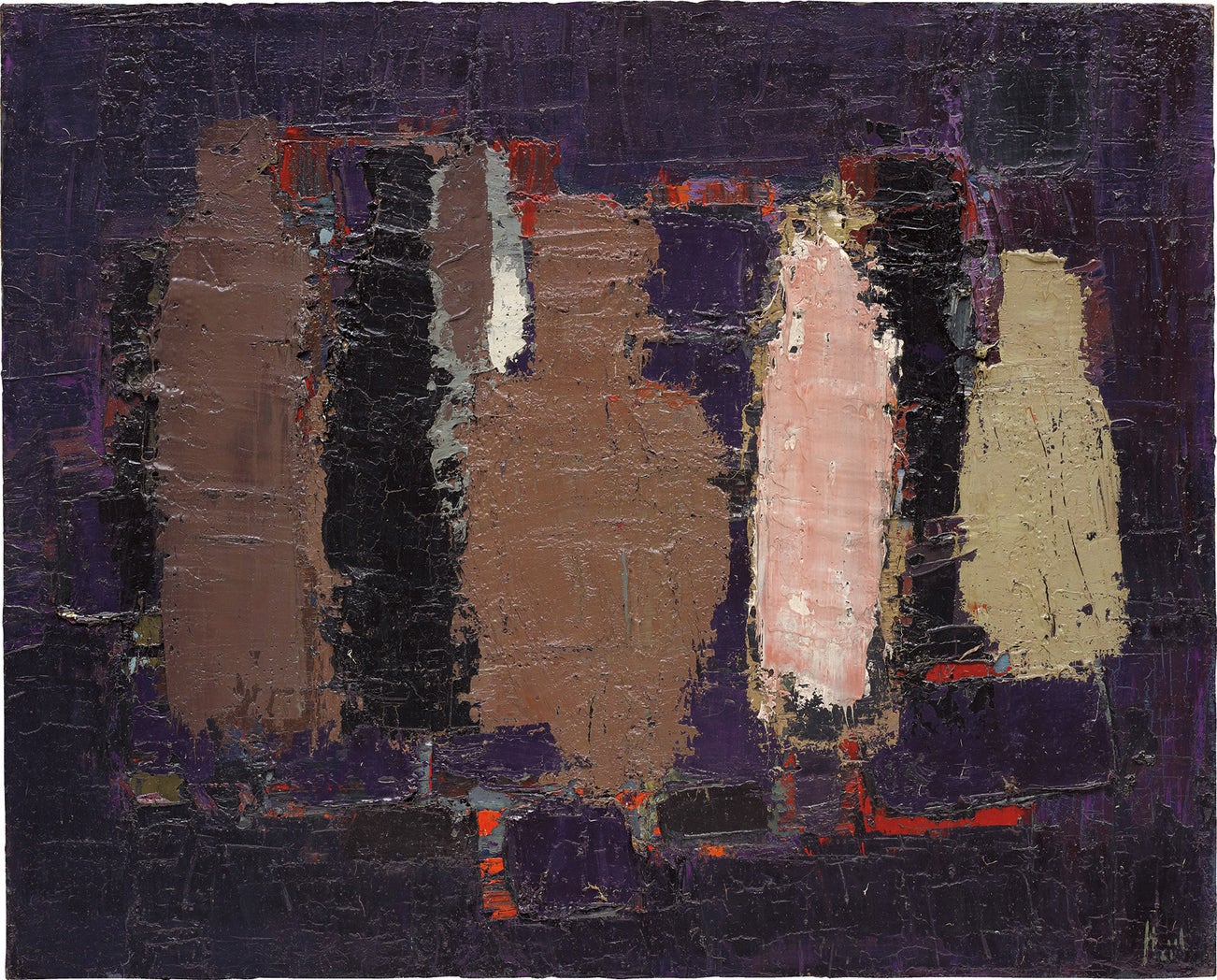 Visually and compositionally, Bouteilles en brun, ocre et rose (Bouteilles: Nature morte) is a study in pictorial complexity. Resisting strict visual likeness, the painting nonetheless delineates the contours of its four eponymous protagonists clearly and recognisably, playing with codes of representation that oscillate between figuration and abstraction. The thick impasto and rough textures that coat its surface are striking and sensuous, veering away from the flatness and distant coolness that typically define the genre of still life. ‘We must retire in the shadow of the sails, clinging to each barely perceptible plan’, wrote de Staël, ‘if we do not want to end in fresco of Pompei, in platitude’ (Nicolas de Staël, ‘Letter to Jacques Dubourg’, June 1952). As a means to heighten the tensions that lie beneath the composition’s tempered appearance, de Staël deploys a rich palette of blacks, navy blues, browns, and rose, at times punctuated by discreet strokes of red to further animate the work’s earthy palette. While the four bottles placed in the foreground of the painting are given easily decipherable silhouettes, an additional set of black bottles is discreetly carved out in the background, as though slowly looming towards the front of the composition from a distant expanse of dark pigments. These shadowy vessels’ layered presence suggests a sense of depth and analytic expressiveness that imparts de Staël’s stylistic gesture with impressionist conviction, appealing to sensation and instinct as opposed to conventional, straightforward perception.