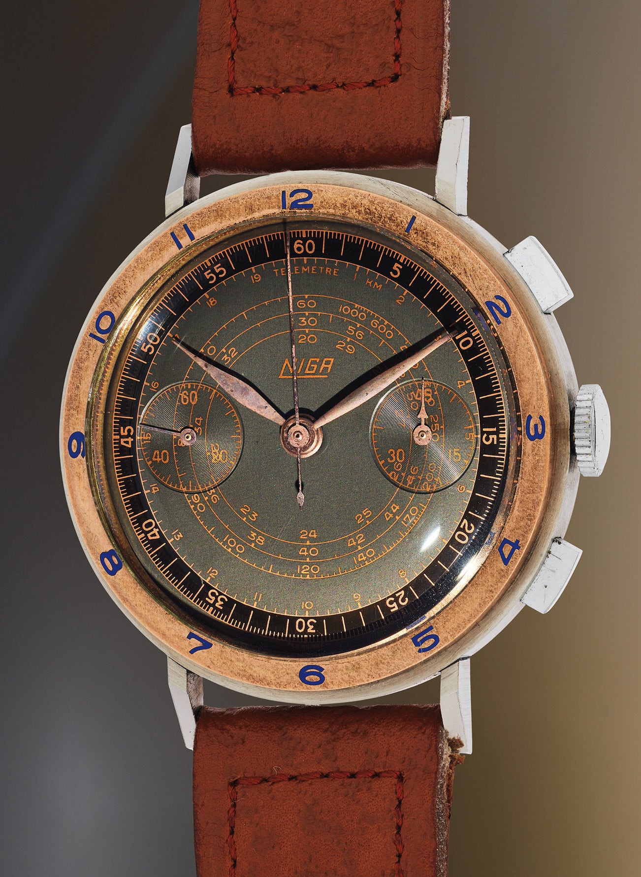 Regardless of the name that graces the dial, the present “time capsule” watch is a phenomenal execution of mid-century chronograph design, preserved in “new old stock”, unused condition. The dial bears a tachymeter and telemeter scale, both rendered in copper gilt text, contrasting against the two-tone dial – glossy black to the outer rim and an anthracite grey inner dial. A pink gold bezel is engraved and enameled in blue, indicating the hours. The main part of the case is ruggedly geometric, with sharply downturned lugs and rectangular pushers. The engravings to the caseback are deeply punched and perfectly crisp – a clear indication of its pristine state of preservation.