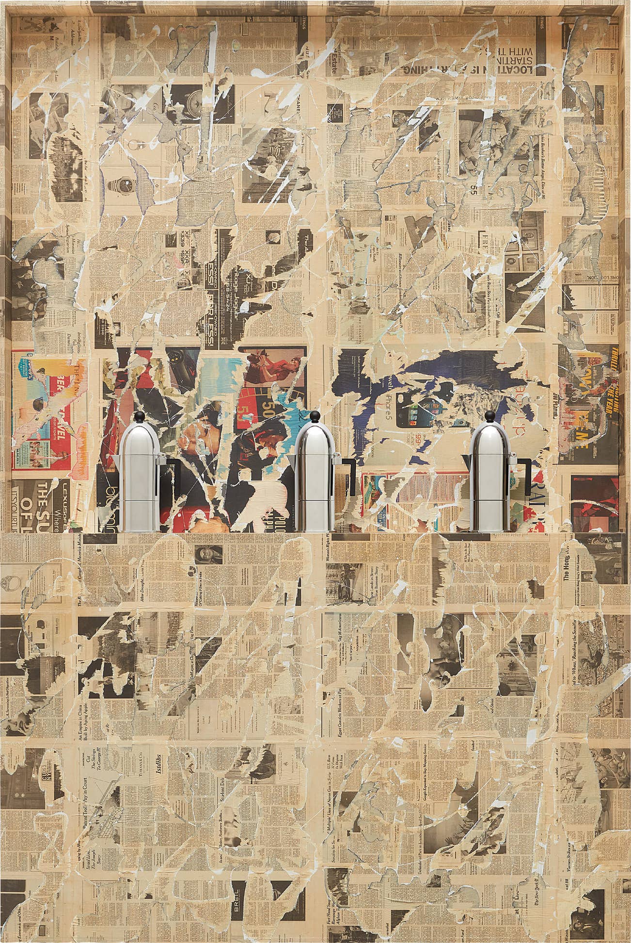 3 La Cupola espresso coffee makers, newsprint and acrylic on linen on panel