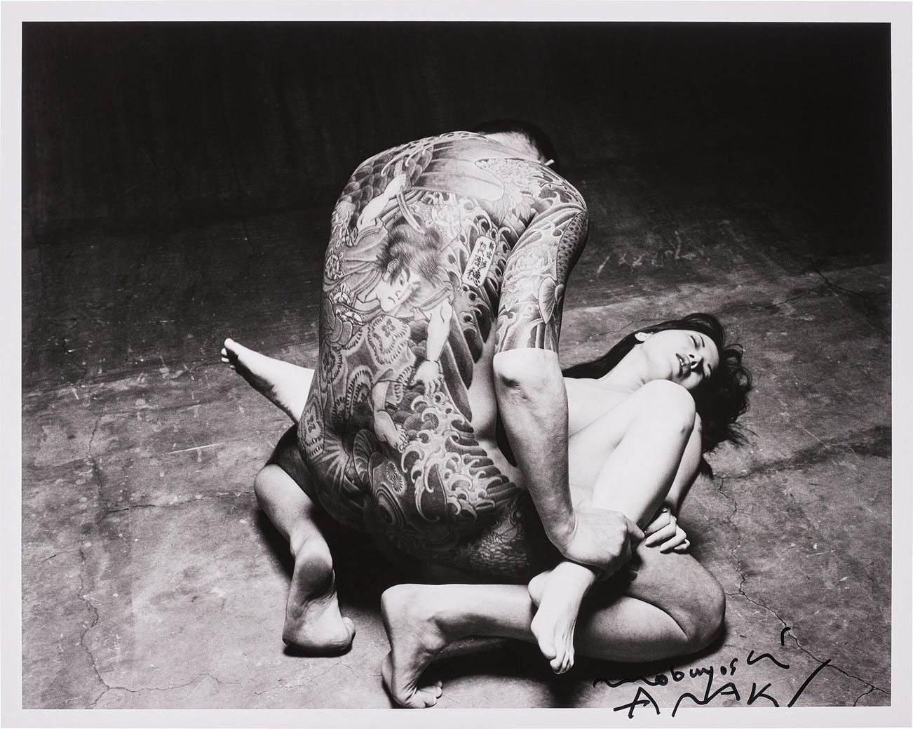 In the following two lots, Tokyo Comedy, 1997, by Nobuyoshi Araki is presented in colour and black and white. Printed from different negatives, these two versions demonstrate Araki’s distinct eroticism. In the chromogenic print, the intensity of the yakuza’s tattoos is accentuated, bringing the moment into a contemporary setting. In the gelatin silver print, the positioning of the figures closer in the foreground, together with the contrast of light and shadows, add to the drama of the scene. These two versions of the same subject provide a glimpse into Araki’s artistic experimentation.