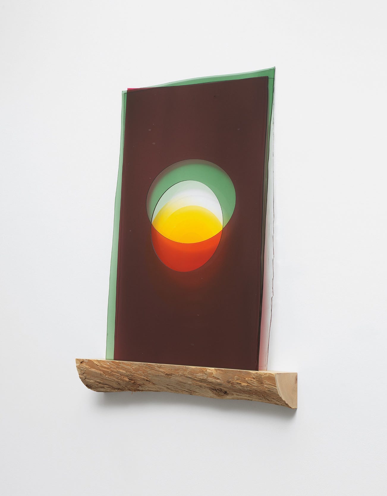 colored glacial-rock-flour glass (light green), colored glass (red, yellow) and driftwood, in 4 parts