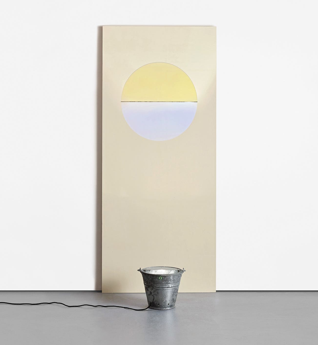 Painted wooden door panel with curved colour effect glass filter and galvanised steel bucket with light fitting.