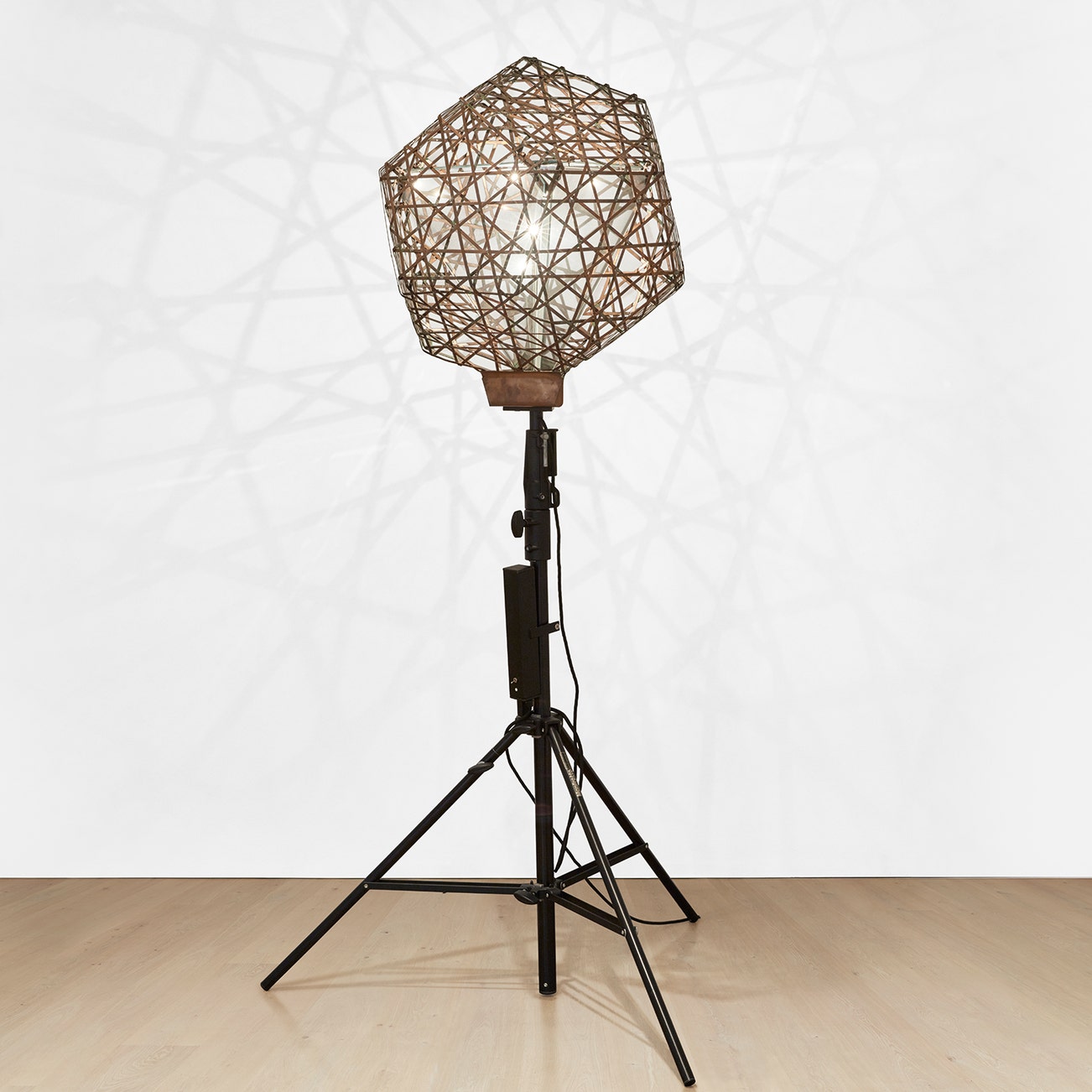copper, semi-transparent mirror, steel, bulb and tripod