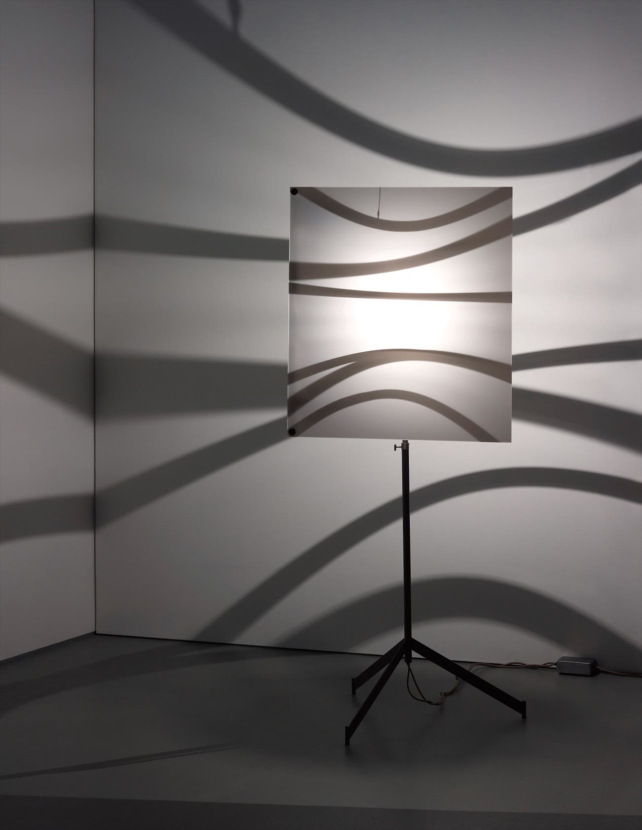 stainless steel tripod, black back projection foil, motor, transformer, halogen bulb, cable