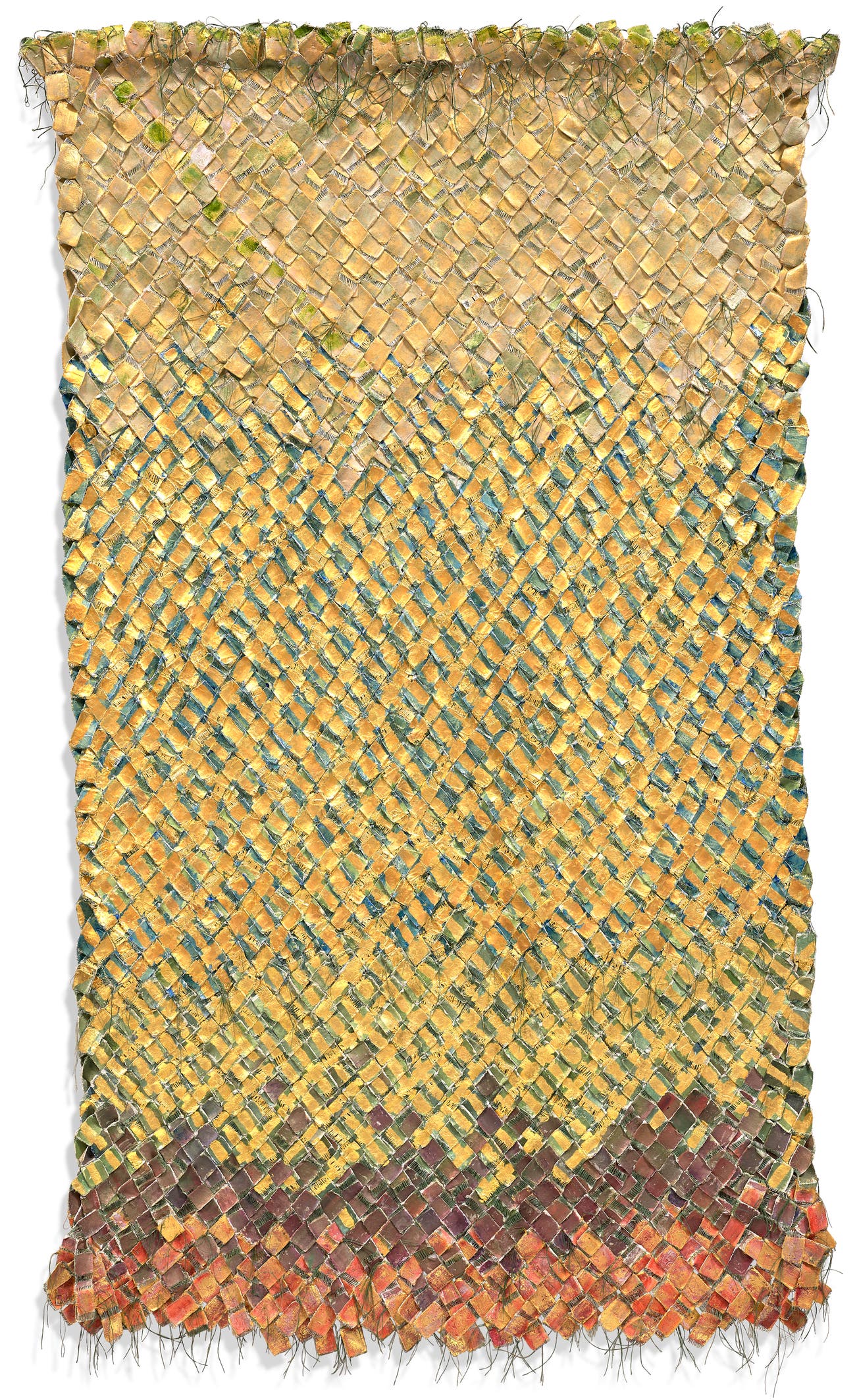 Colombian | 1932At age 22 with a degree in architectural design, Olga de Amaral moved from Bogotá to the United States where she studied fiber art at the Cranbrook Academy of Art in Michigan. She returned to Colombia in 1955, and in 1956 she and her husband, Jim Amaral, opened a workshop of hand-woven textiles. De Amaral's distinctive large-scale abstract woven pieces are often covered in gold and silver leaf, lending them a shimmering, almost sculptural quality in contrast to the feeling of a tapestry. Her richly textured pieces evoke the varied natural landscapes of Colombia as well as ancient pre-Columbian gold artifacts. The artist's architectural background is evident in the precise sculptural quality of her works, but de Amaral says her craft is driven by emotion and that she does not plan for particular patterns to emerge.