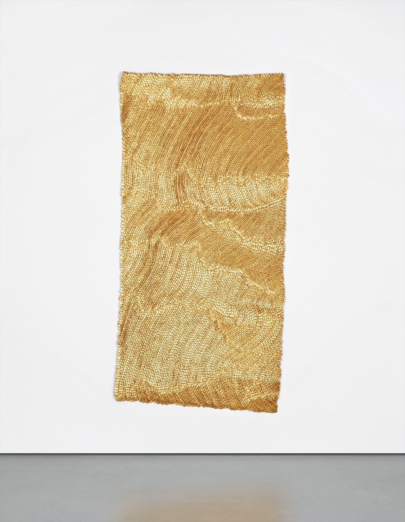 This experimentation in layering later culminated with the use of gold leaf, which ultimately gave her works a sculptural depth in addition to capturing light. The interlacing in her weavings became much more complex and the texture became denser adding dimensionality, clearly emulated in the present lot. This dense texture was also produced by the incorporation of gesso, used in the application of the gold leaf, creating sophisticated patterns. These curves create a wave-like pattern that is reminiscent of Japanese textiles produced between the fourteenth and early seventeenth century, which were considered prime examples of the height of creativity and beauty during the Edo period, a booming economic and artistic period in the history of Japan.