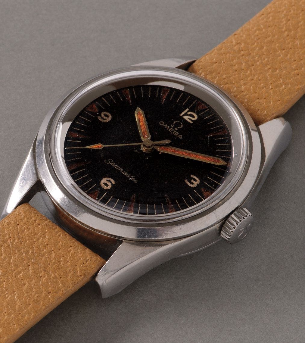 The present watch is preserved in its original condition, with signs of wear illustrating its use as a military watch. The case back is engraved “P.A.F”- the acronym for the Pakistani Air Force. The dial, with broad arrow hands, have aged to a wonderful shade of espresso, as have the indexes. Even the crystal is original with the minuscule Omega logo found at its center. For enthusiasts of military issued watches, this Omega is an extremely rare treasure that is certain to delight and excite.