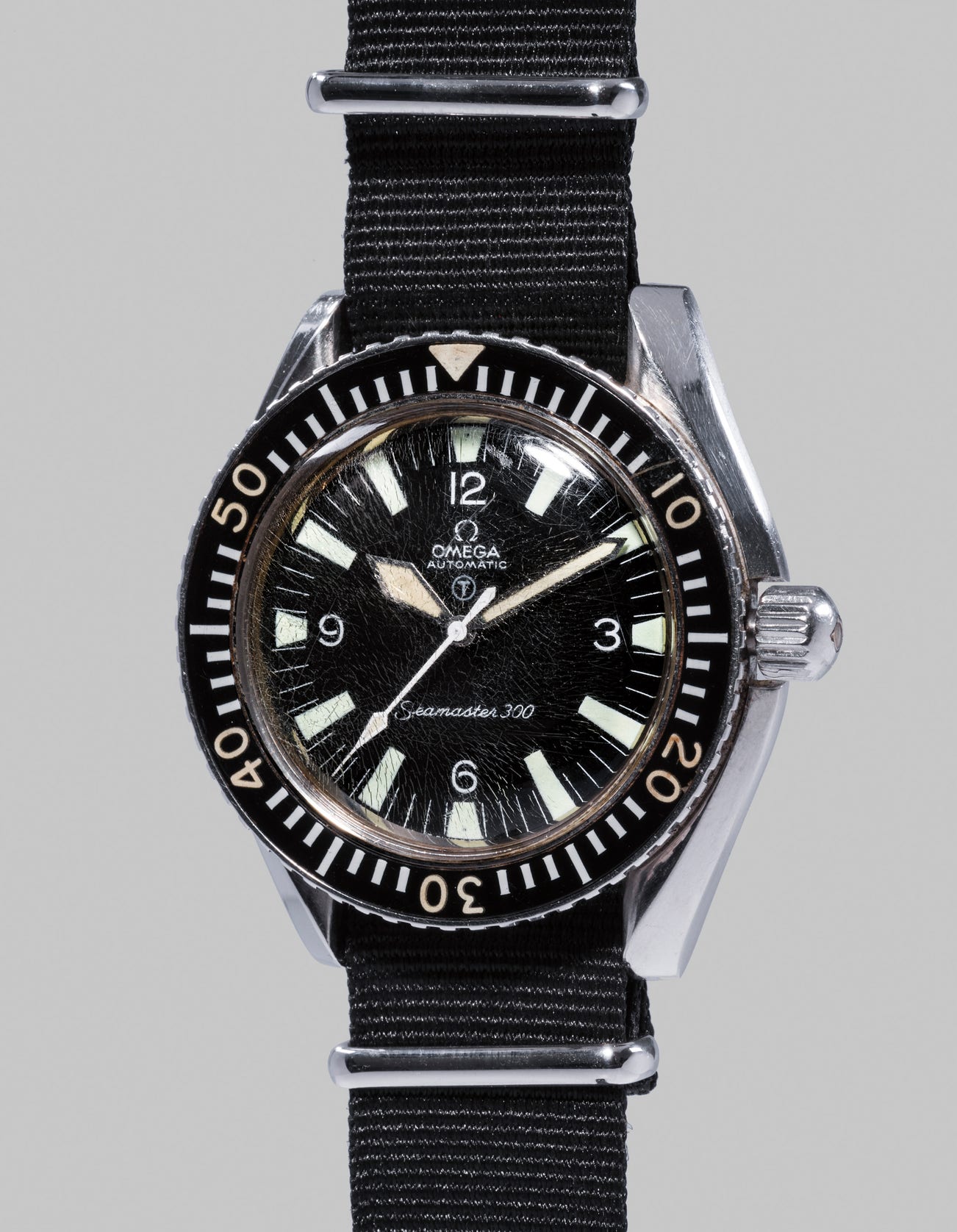 As many were used in combat and on military deployments, very few have survived with all factory military features intact. We are therefore thrilled to offer this piece in its full “mil-spec” configuration. Surviving in remarkable original condition, it is one of the finest and best-preserved examples of a military Seamaster 300 to appear on the market which is even more impressive considering its regular use through at least 1971 by a diver of the Royal Navy.