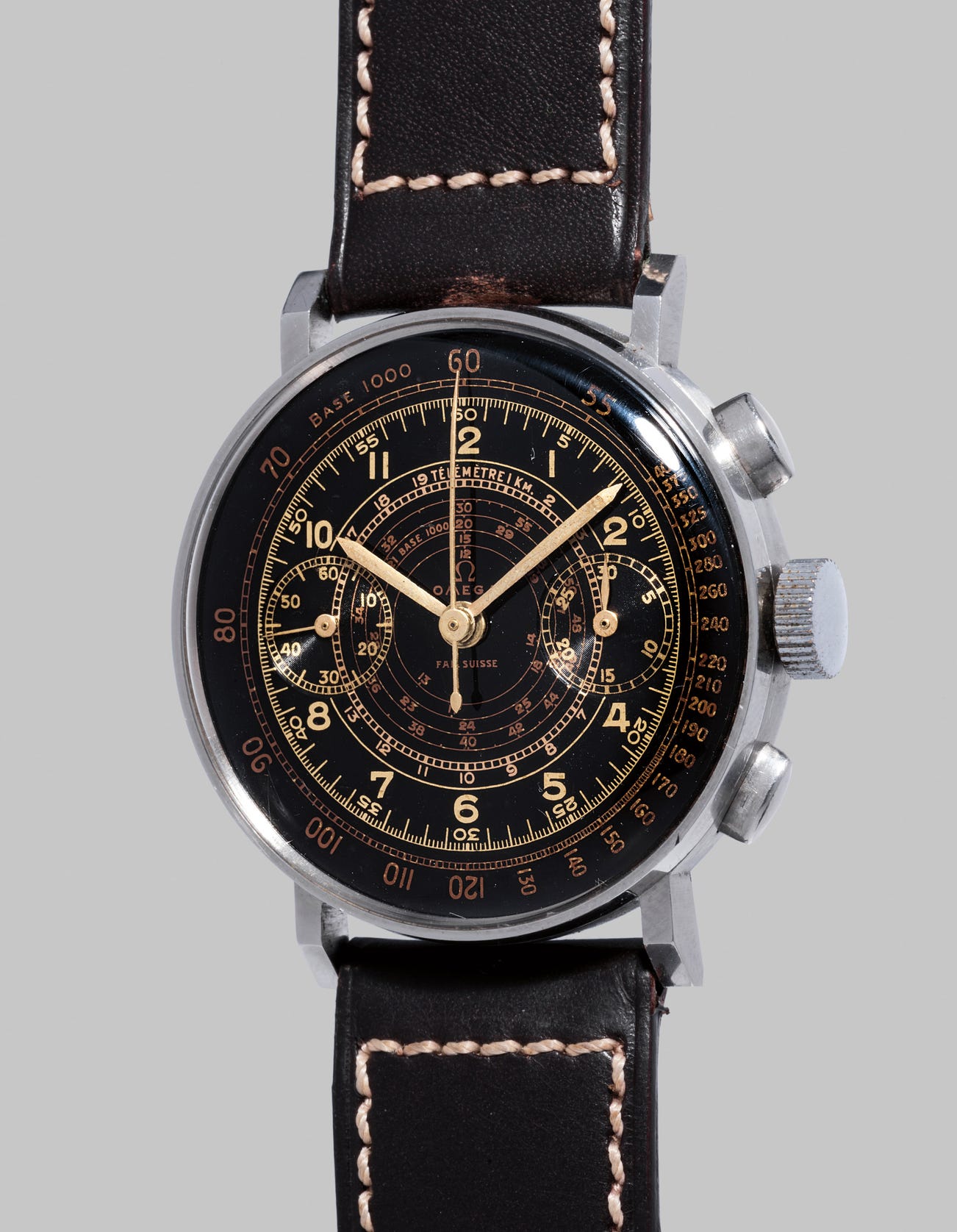 Most impressive is the rare, glossy black dial, with a multi-scale design that Omega is particularly known for. Such multi-scale designs were often printed on enamel or glossy dials. The scales are printed in different shades, ranging from an intense gold to various tones of copper, giving the watch a lot of charisma and depth. The dial is most notably stamped "Fab. Suisse", which collectors identify as signifying the watch was to be imported in France. This is particularly important and fitting as the dial is also stamped "Télémètre" in French, which is correct. Research furthermore states the present watch was delivered to the French colonies in 1939.