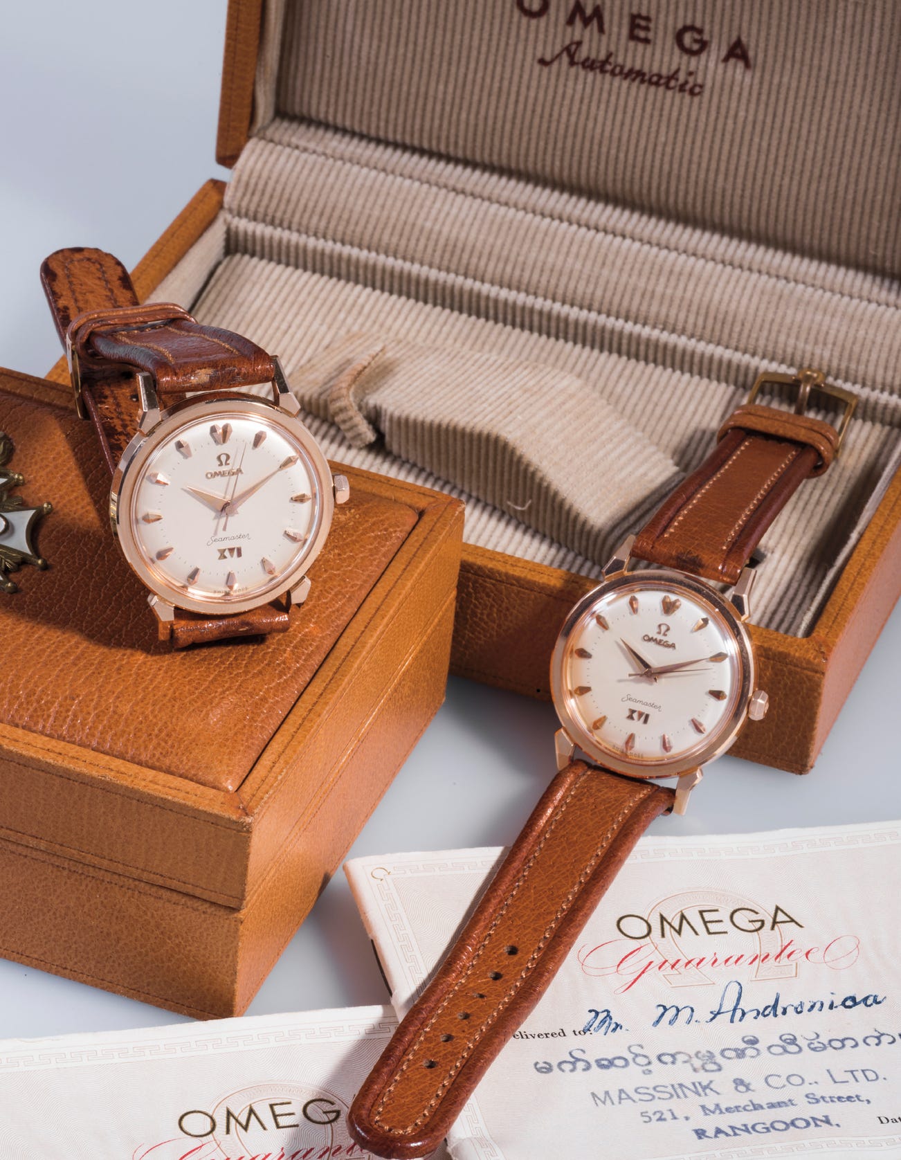 The present lot, featuring two examples of reference 2850S.C., is interesting not only due to its historical importance, but also because the two watches were born together in Bienne Switzerland and sold 2 years later on the same day on March 24th in 1958 in Rangoon, Burma. The mystery surrounding these pieces thickens when we learn that these two timepieces were not only sold to the same person, but have immediately succeeding case and movement numbers making these two lots “Olympic Twins”.