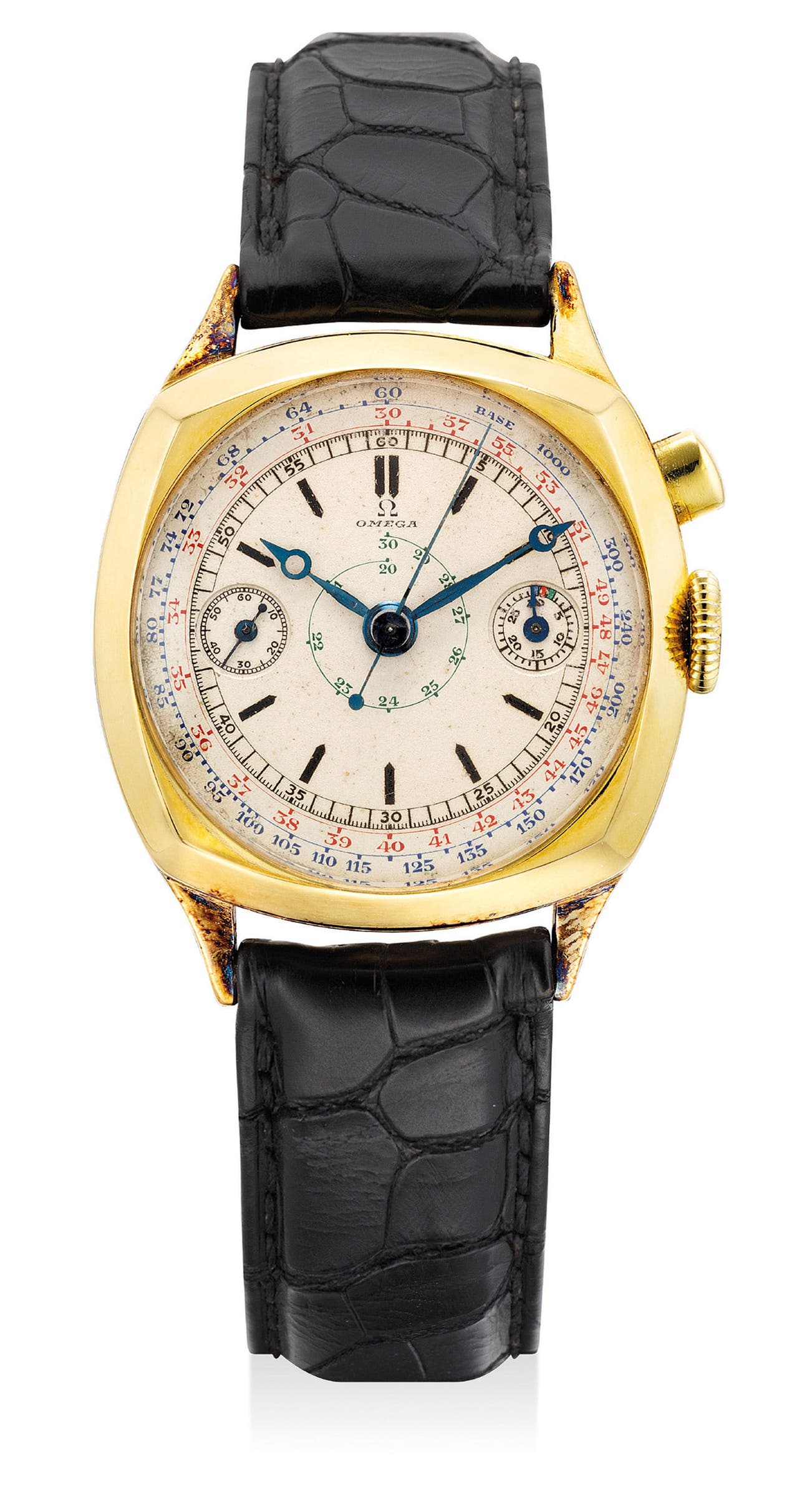 A fine and attractive yellow gold cushion-shaped single-button chronograph wristwatch with blued Breguet hands