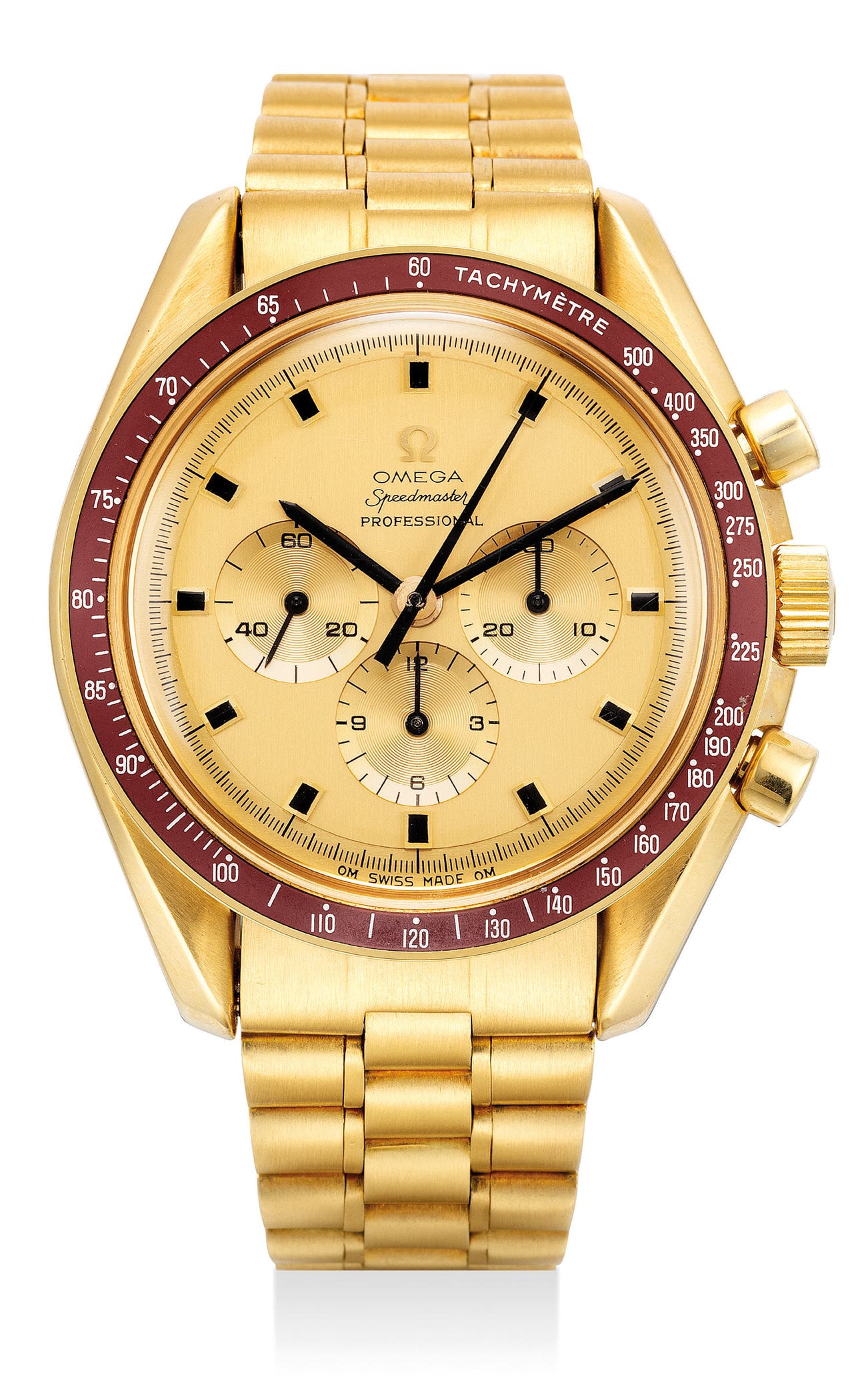 The reference 145.022 in yellow gold chronograph was released following this historical event as a commemoration of this accomplishment. Omega produced 1014 examples with the first and second examples offered to the President and Vice-President of the United States, however they were declined due to compliance reasons. The group up to watch number 32 were offered to mission astronauts and they were engraved “To mark man’s conquest of space with time, through time, on time”. The remaining watches were sold to the general public and like the present example number 626, featured an engraved back reading “Omega Speedmaster-Apollo XI 1969-The First Watch Worn on the Moon”. The 145.022 has a strong appeal with gold dial, onyx numerals and burgundy bezel.