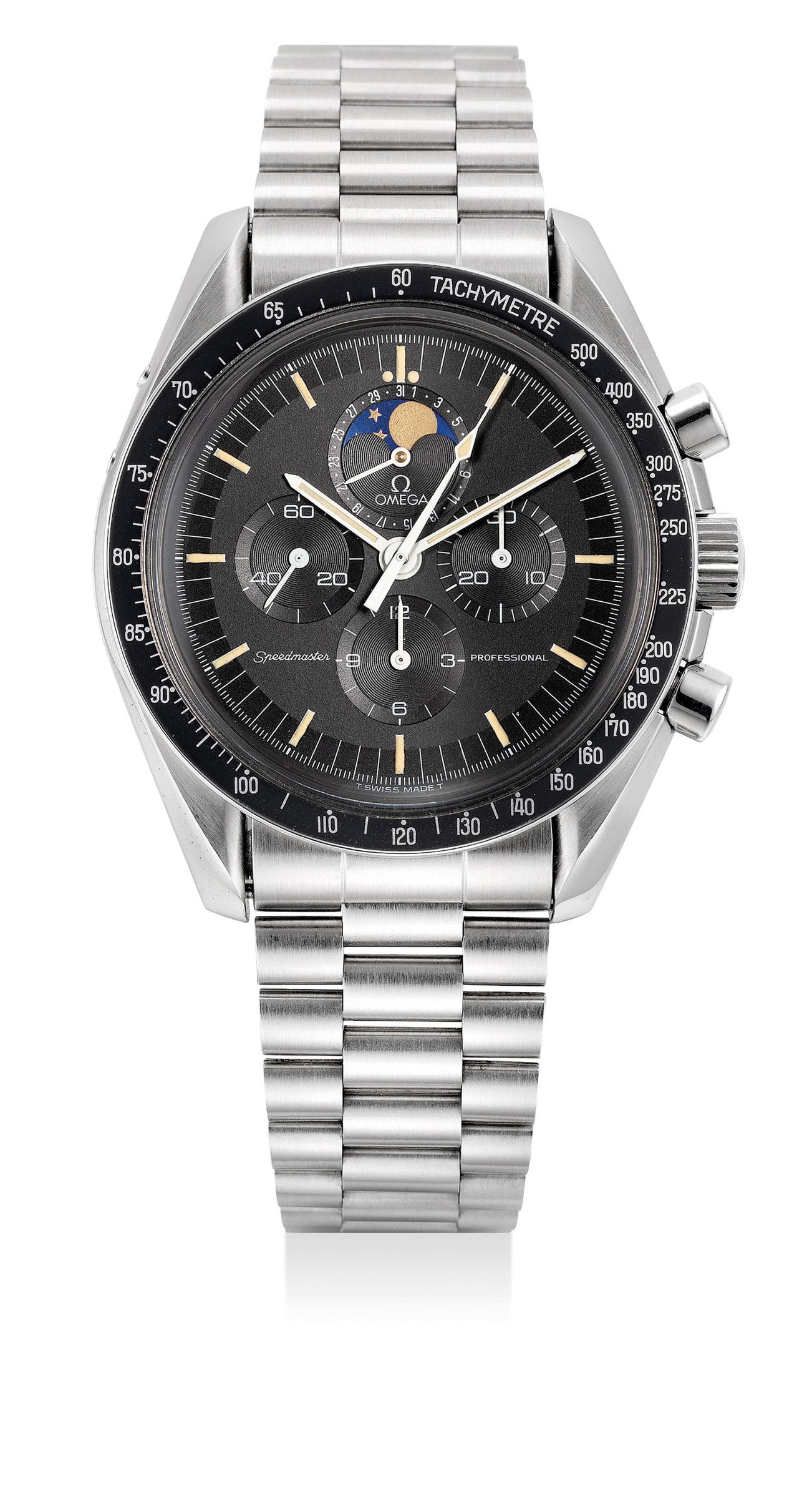The present example of a Speedymoon belongs to the final version which features a larger faceless moon, presented in excellent overall condition and sporting a rare 1447 bracelet belonging to the first series.