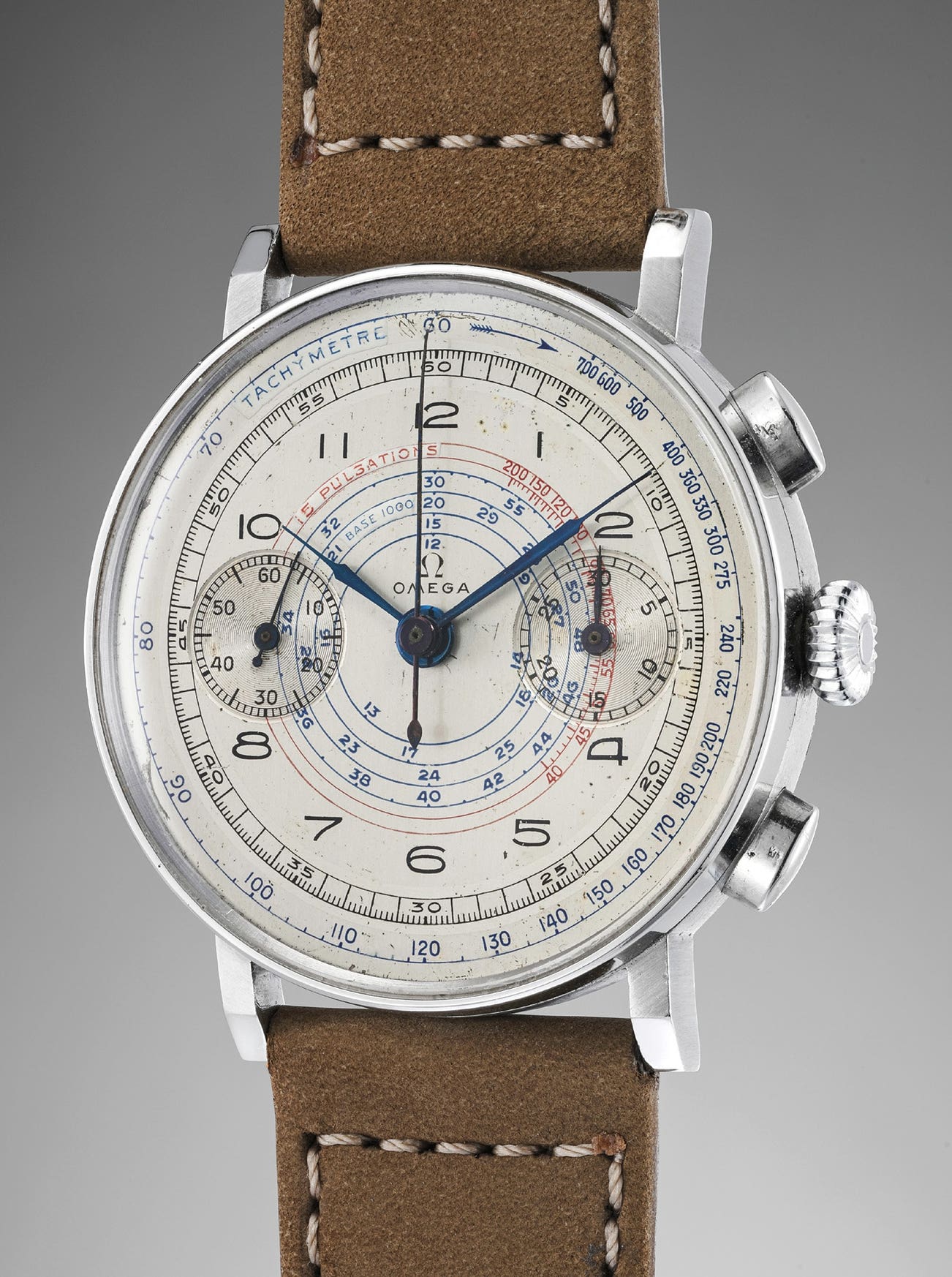 The present chronograph display's Omega’s incredible know-how in creating chronograph wristwatches. Housing the iconic 33.3 caliber, this example is preserved in excellent condition, with sharp angled lugs that do not display signs of over polishing. The 37.5 millimeter case is very large for the period, its presence enhanced by the three dimensional angled lugs. It is particularly impressive that Omega had the foresight to create such a large and modern looking watch in the late 1930s.