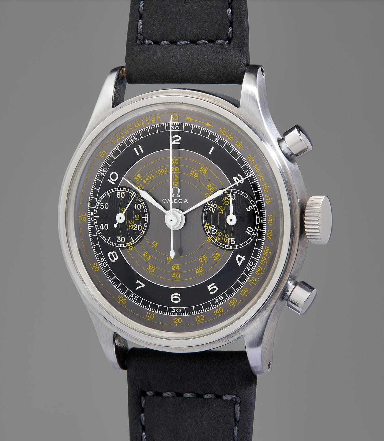 Featuring an oversized, case with screw-down caseback, it must be viewed as an early, multi-purpose tool watch perfectly suited for those with increasingly active lifestyles. Due to the use of a waterproof case, the dial on the present example has luckily been extremely well-preserved, with the vibrant neon yellow printing of the scales rendered highly legible against the black and grey dial. None of the colors of the dial have faded. Additionally, the case has escaped the hardships of the intervening decades, with crisp, downturned lugs and clear signs of the original finish throughout.
