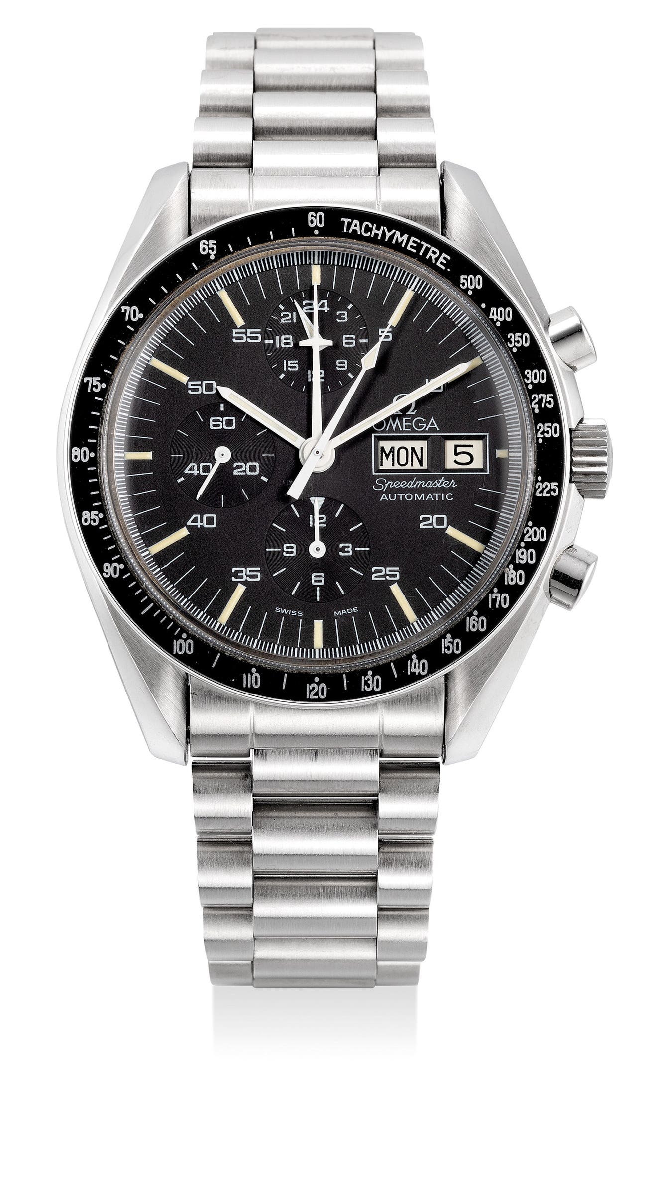 A fine, rare and very well-preserved stainless steel chronograph wristwatch with day, date, tachymeter scale and bracelet, guarantee and presentation box