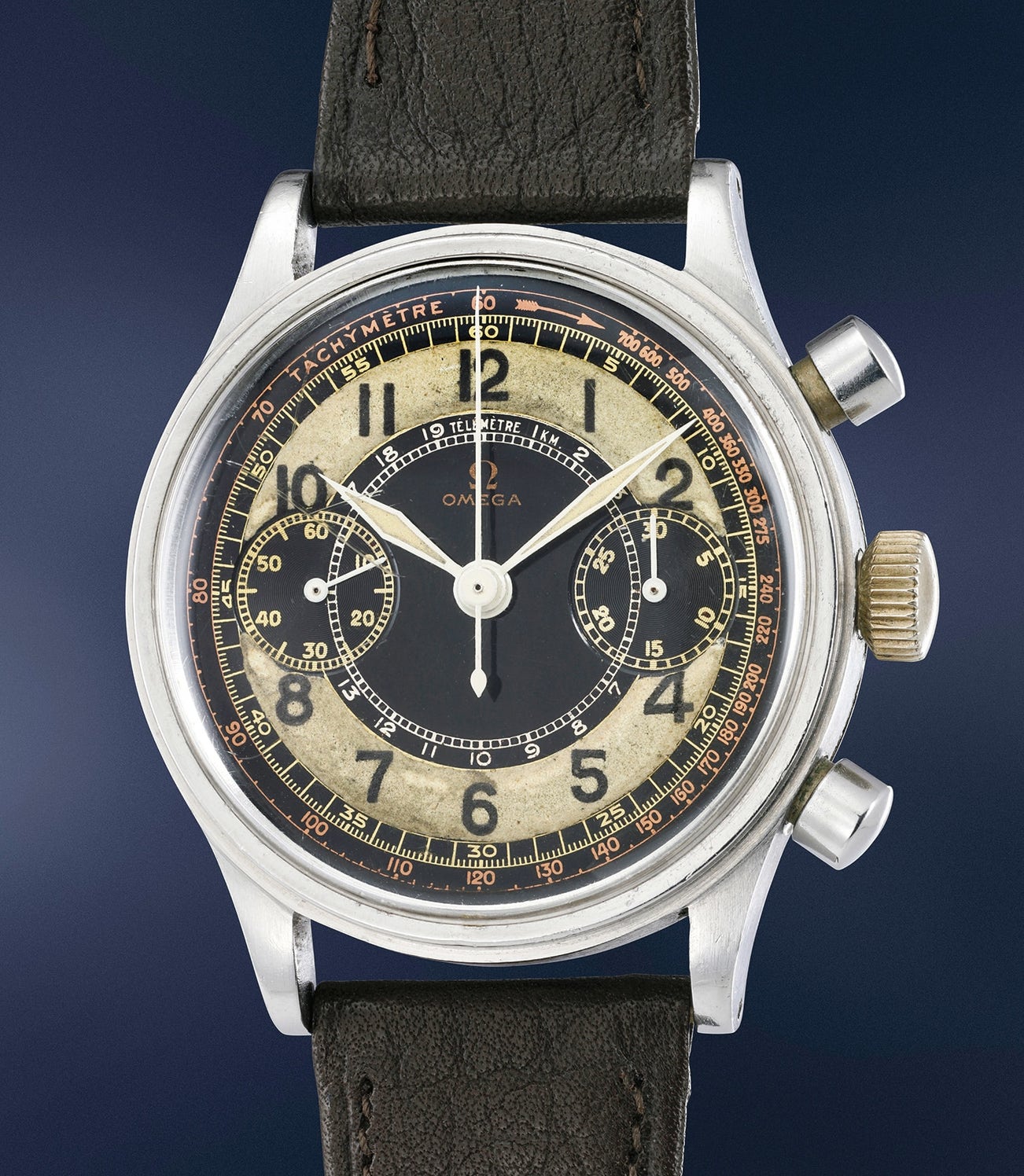 Additionally, along the outer edge of the dial is a copper-colored tachometer scale, while the inner part of the hour ring features a silver-colored telemeter scale. The masculine proportions of this 38mm chronograph retain sharp edges throughout the case and excellent definition to the bezel and lugs. Underneath its screw down case back resides Omega’s manually wound caliber 33.3 chronograph movement. According to the Extract from the Archives, this example from 1945 was delivered to the French Colonies, and has managed to survive 70 years with hardly any signs of wear.