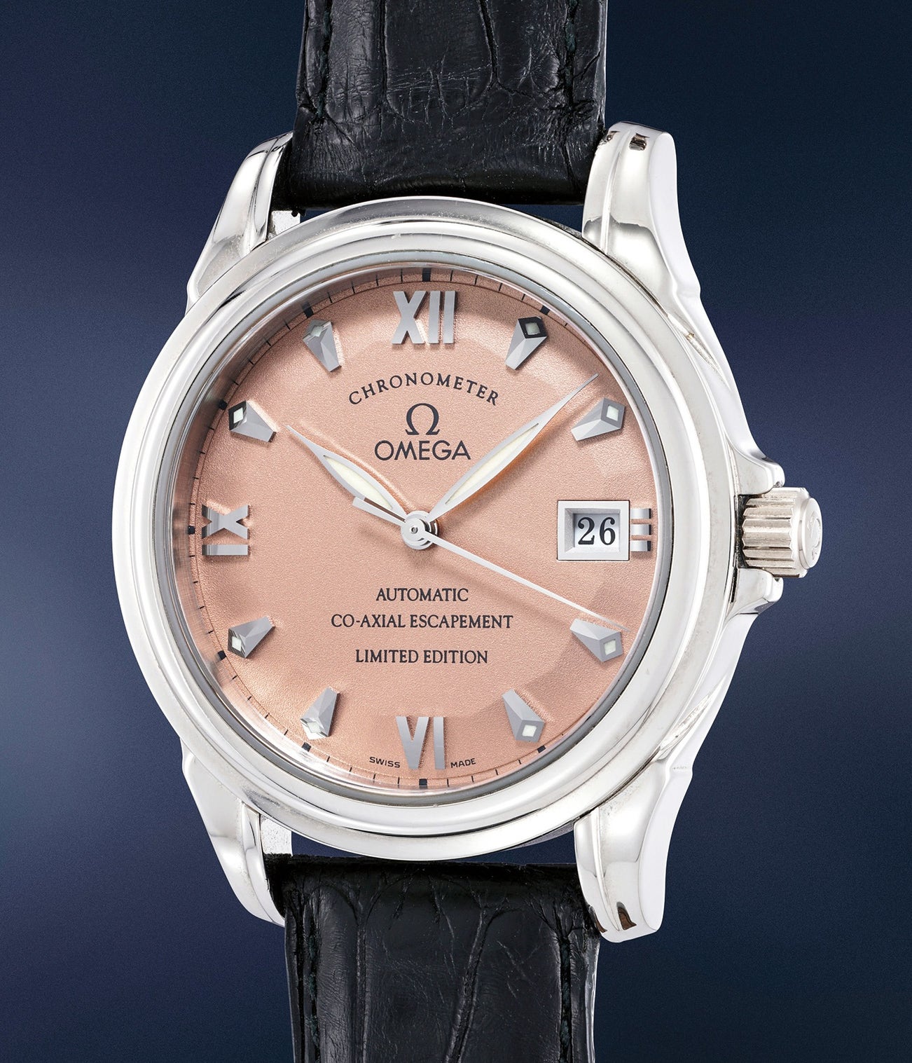 An extremely rare and impressive platinum automatic wristwatch with center seconds, date, co-axial escapement, salmon dial, Guarantee and box. Number 34 of a 99 pieces limited edition