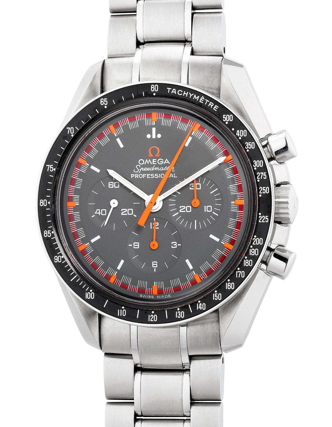 In 2004, Omega reintroduced the “Racing” dial and was made only for the Japanese market referenced 3750.40. With the design of the dial very similar to examples from the 1960’s, the new model featured a crayon grey dial with red, white and orange accents. Upgraded and an understated feature, the orange accents on the dial were applied with luminous material, and when one sheds UV light on the dial, the orange accents display a neon glow. Adapting essentially the same concept as the original models, the tri-colored dial provides an enhanced legibility for wearers. Contrasting beautifully against a crayon grey dial, the Speedmaster “Racing” Japan is without a doubt a wonderfully executed iteration of the much loved Speedmaster “Racing” model. It is believed that only 2,004 examples were produced.