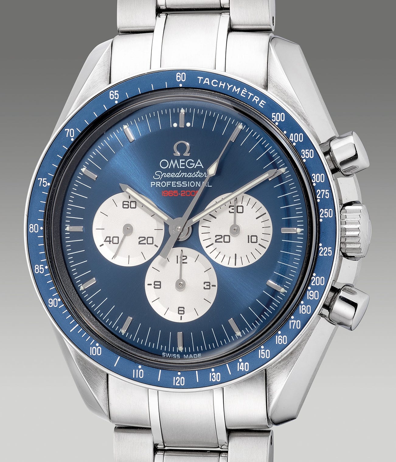 Preserved in excellent overall condition, the present example numbered 1,905 is further charmed by the full set of accessories. Distinctive due to its blue bezel paired harmoniously along with a matching blue dial with red inscribed commemoration dates on the dial, it is certainly a vibrant iteration of the coveted Speedmaster.