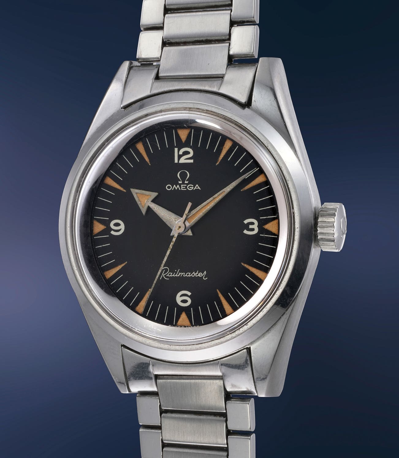 If early Railmaster watches are a rare find, examples in condition so impressive as the present piece are close to impossible to come along. The classic "broad arrow" hands, sharp dagger-like luminous indexes, and beautiful matte black dial are flawlessly preserved. Among the three Omega “tool watches” of the time (Speedmaster, Railmaster and Seamaster), the Railmaster featured the simpler dial design, with no diving or tachymeter bezel. This grants to the entire watch remarkable purity and legibility. The case measures a generous 38 millimetres in diameter, thanks in part to the presence of a soft iron inner case, held in place by a thin metal gasket inside the back. The inner case providing anti-magnetic protection of the movement, was made of "mu-metal" a nickel-iron alloy, acting as a Faraday cage.