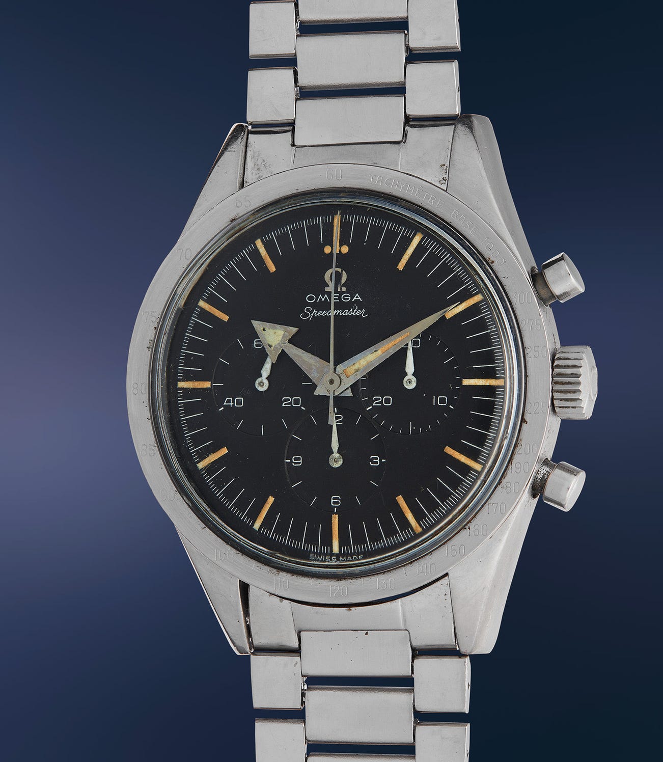 The accompanying, original Omega guarantee with matching movement number is marked correctly as a reference 9700, and it was offered with a reference 9700 spec sheet featuring hand calculations by the original owner. As depicted on these accessories, as well as advertisements of the era, early Speedmasters were described by Omega as the reference 9700. It is also accompanied by an Omega pamphlet dated 1964, as well as its original bracelet.