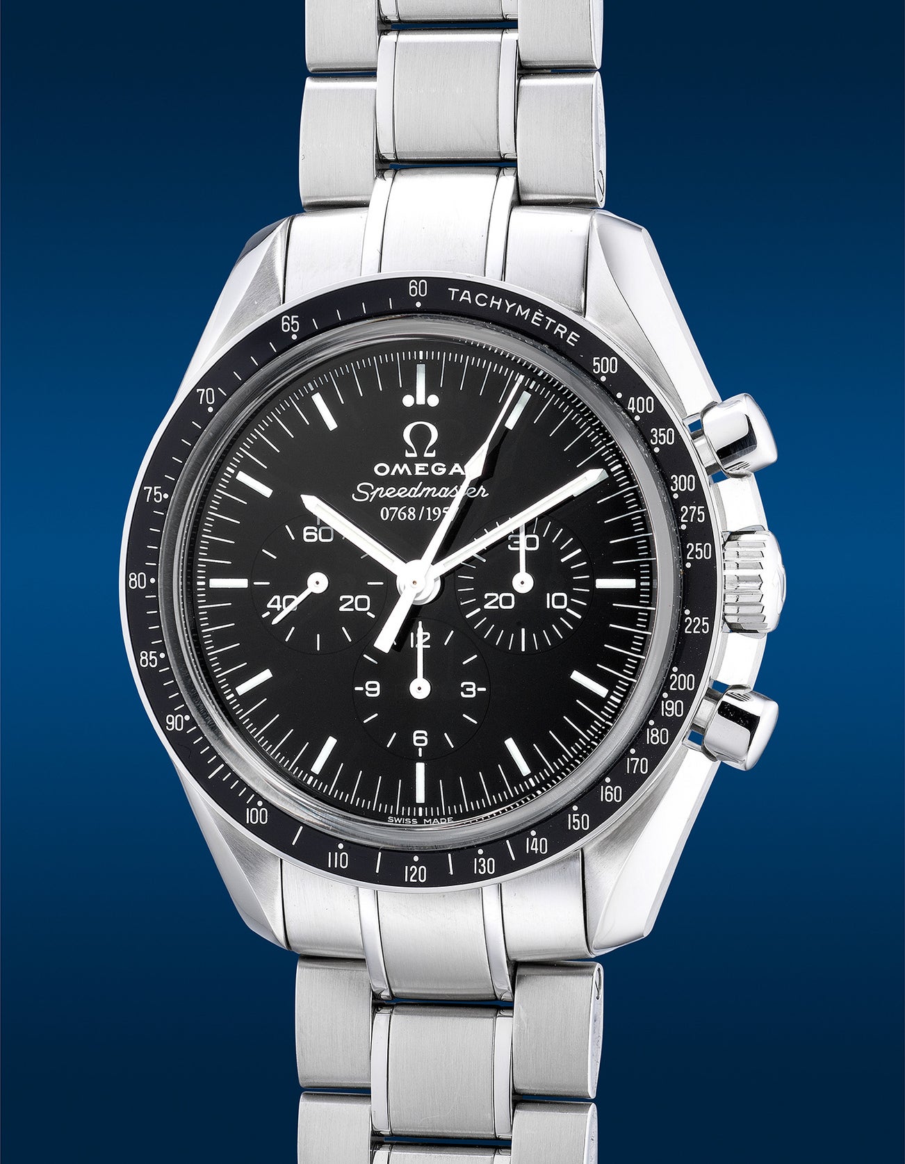 In celebration of the Speedmaster’s 50th anniversary, the manufacturer issued a limited series of 1957 Moonwatches in stainless steel. To achieve a vintage aesthetic, the present wristwatch features the iconic curved and faceted lugs, a tachymeter scale on the bezel and an ebony black enamel dial. As a tribute to its lineage, this Speedmaster Professional Moonwatch proudly carries the original Omega logo from 1957, in the heart of the dial, just above its unique limited serial number- 0768/ 1957.