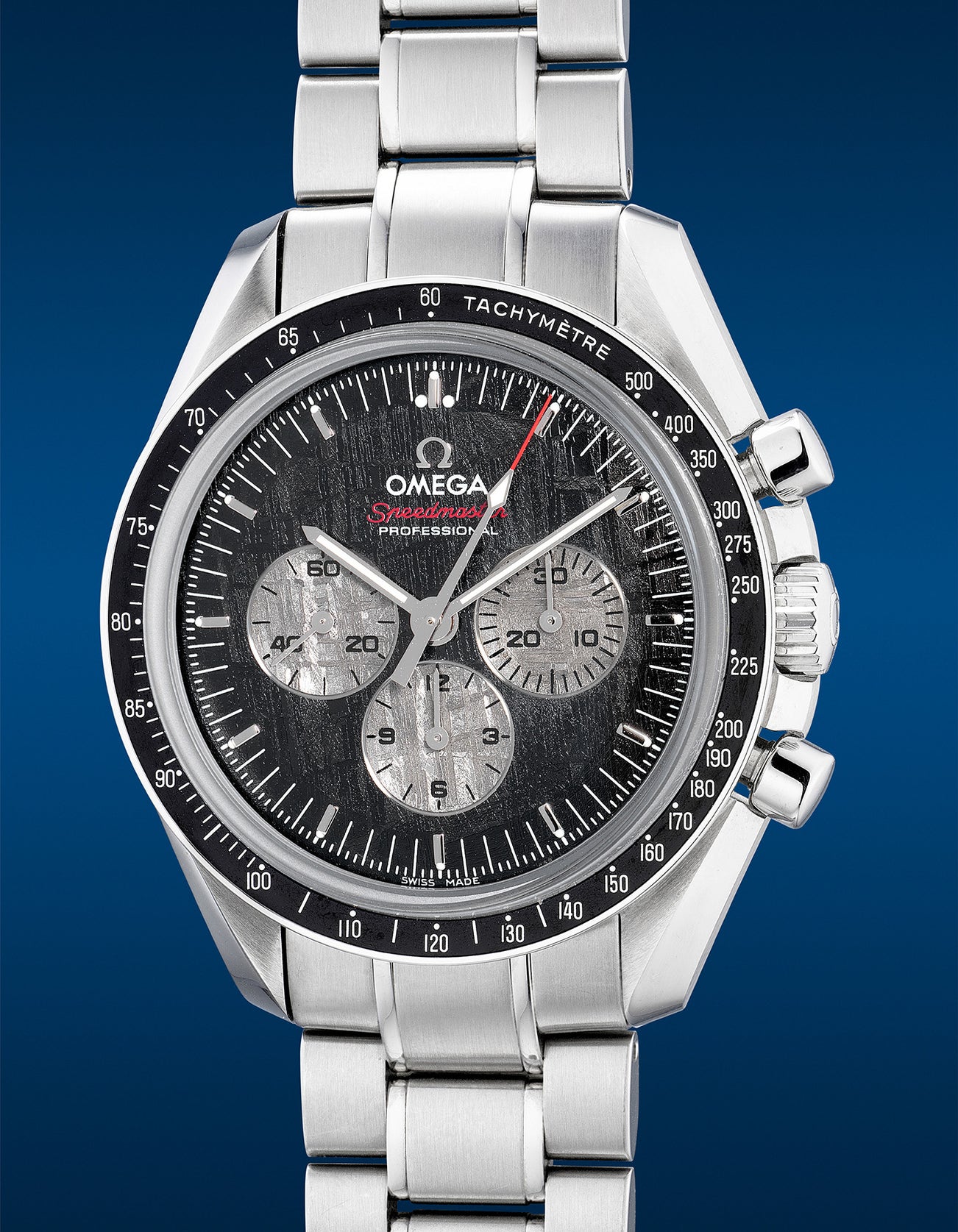 In 2010, to celebrate the 35th anniversary of this monumental event, Omega released the present Speedmaster Professional with the beautifully textured meteorite dial. Extruding with coolness from the natural slate grey meteorite, the black was achieved through a surface oxidation process, no two pieces are the same and therefore unique with its own charm. Sporting with a striking red inscription of Speedmaster at 12 o’clock, the chronograph hand also has a matching red tip. Furthermore the caseback is embossed with Apollo-Soyuz patch and the date of the historical event. Powered by the calibre 1861, an evolution from the Lemania based caliber 861 movement from 1960s. A discontinued model, the present example is numbered 236 of a limited edition of 1,975 pieces and is preserved in excellent overall condition and accompanied with its full accessories.