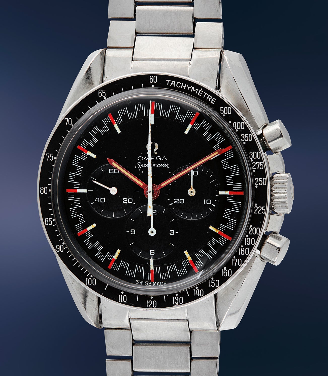 What makes the present lot exceptional is the utterly rare “exotic”, matte black dial known as the “racing dial”, with a red handset and bicolor red and white hour indexes. This configuration does not appear often, and there are extremely few examples that have ever appeared publicly. It carries a “two liner” designation with Omega and Speedmaster only, and omits the designation Professional as found on later examples. Also, the “T” does not flank the “Swiss Made” script at the bottom of the dial for tritium, another indication of its early origins. A nearly identical example is shown in the Moonwatch Only book. The colors of the dial and hands are vibrant, and together with the well-preserved condition of the case, make it an exciting addition to any collection of rare sports watches.