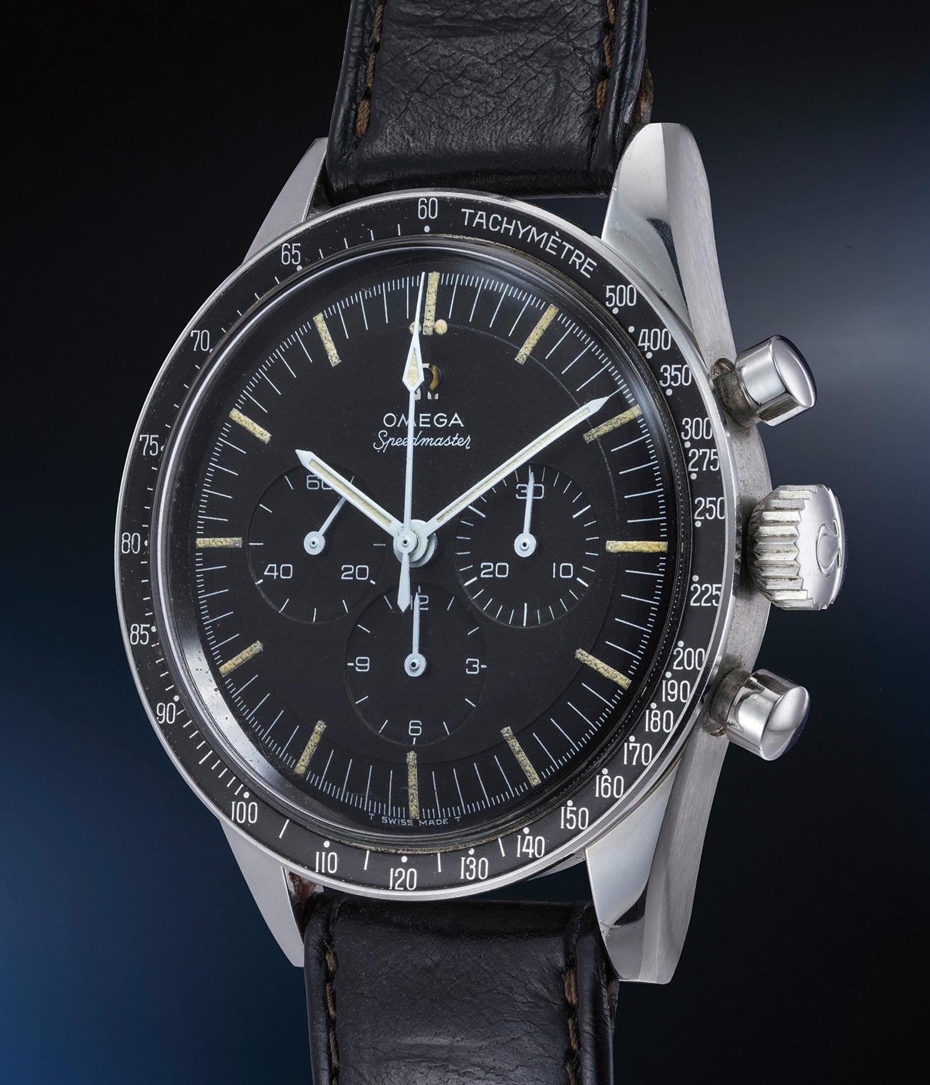 The importance of this reference is matched by this example’s superlative condition – possibly unpolished and free of much of the wear and tear visible on other models, the present timepiece still showcases its original Omega leather strap with Omega hang tag on its buckle. The bezel showcases little to no signs of ageing, and the evenly aged matte black dial and hour indicators completes the captivating allure this watch has to offer. The present Speedmaster reference 105.003-65 is certain to enchant collectors both for it historical role in American space exploration and its rarity.