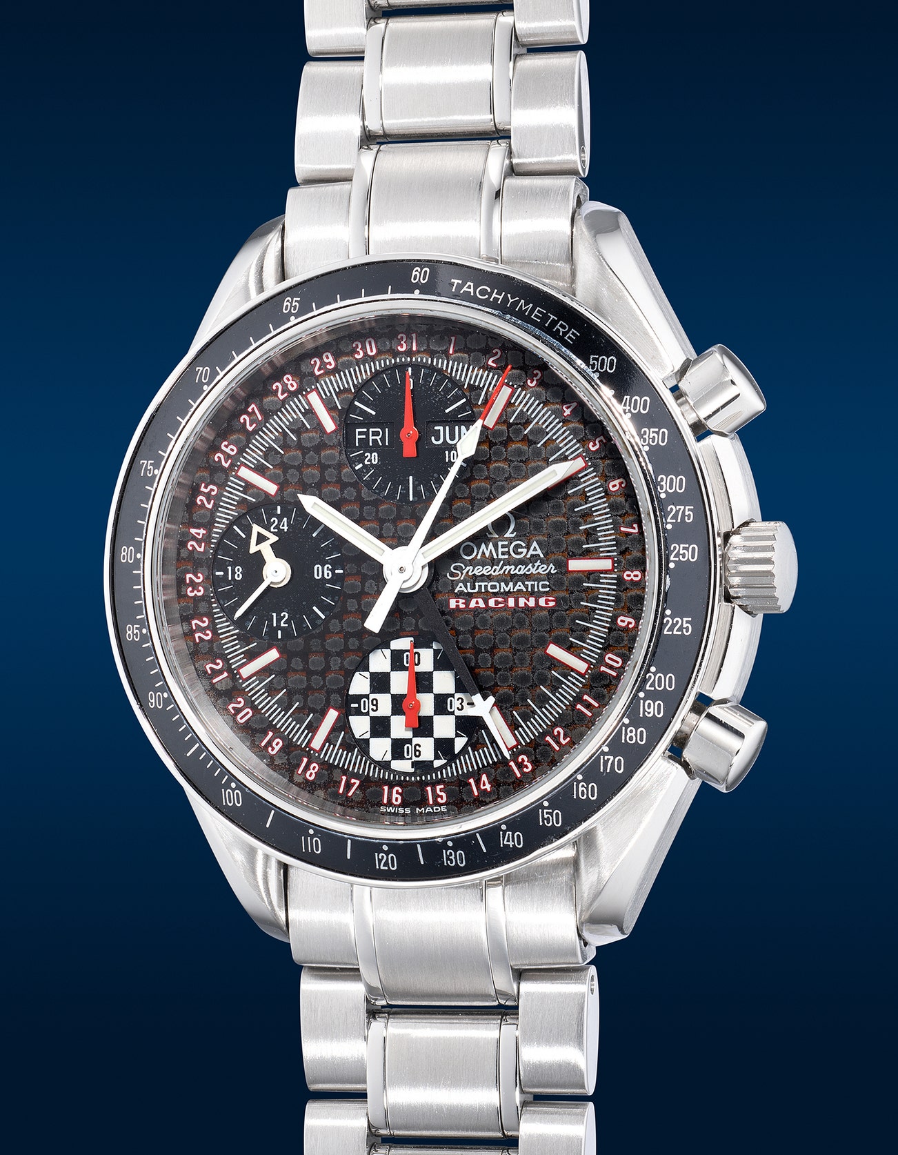 - Beyond its association with Schumacher and Omega’s role as official timekeeper of Formula 1, the limited edition piece channels the essence of high performance. Its dial is crafted from carbon fiber, the advanced composite material fundamental to modern race car construction. The vibrant red accents delineating the “RACING” inscription, hour markers and date track pay homage to the colors emblazoning Formula 1 vehicles. The caseback bears the engraving “WORLD CHAMPION 2002” and Schumacher’s signature, highlighting the watch’s provenance as a tribute to an historic season.