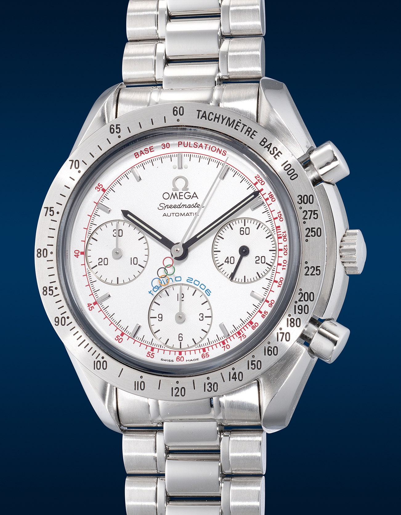 - The Speedmaster Reduced Torino Olympics chronograph is housed within a 39mm stainless steel case, a canvas of contrasting satin-brushed and polished surfaces that frame the delicate silvered dial. An engraved tachymeter scale circumscribes the bezel, referencing the model’s motor racing heritage, while a pulsometric scale provides a subtle athletic accent.
