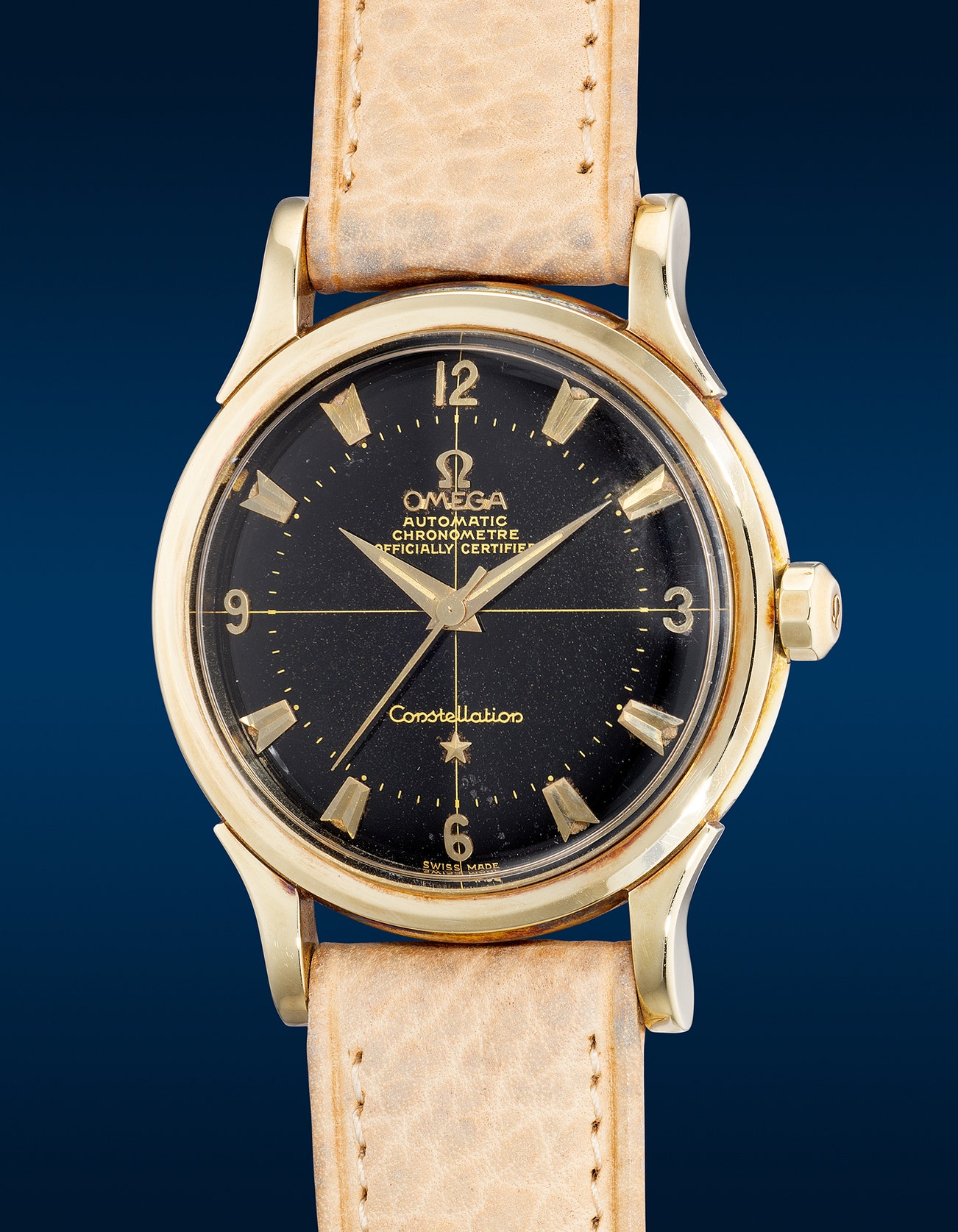 -Along with the applied dart-shaped markers and dauphine hands, the symmetrical dial display with cross-hairs at the center reflect the hallmarks of the era. The yellow gold Constellation signature at the top and star at the bottom create a subtle yet balanced design. As the dial is over half a century old, an attractive cluster of little gold specks have surfaced, resembling a starlit night sky against the sober dark backdrop.