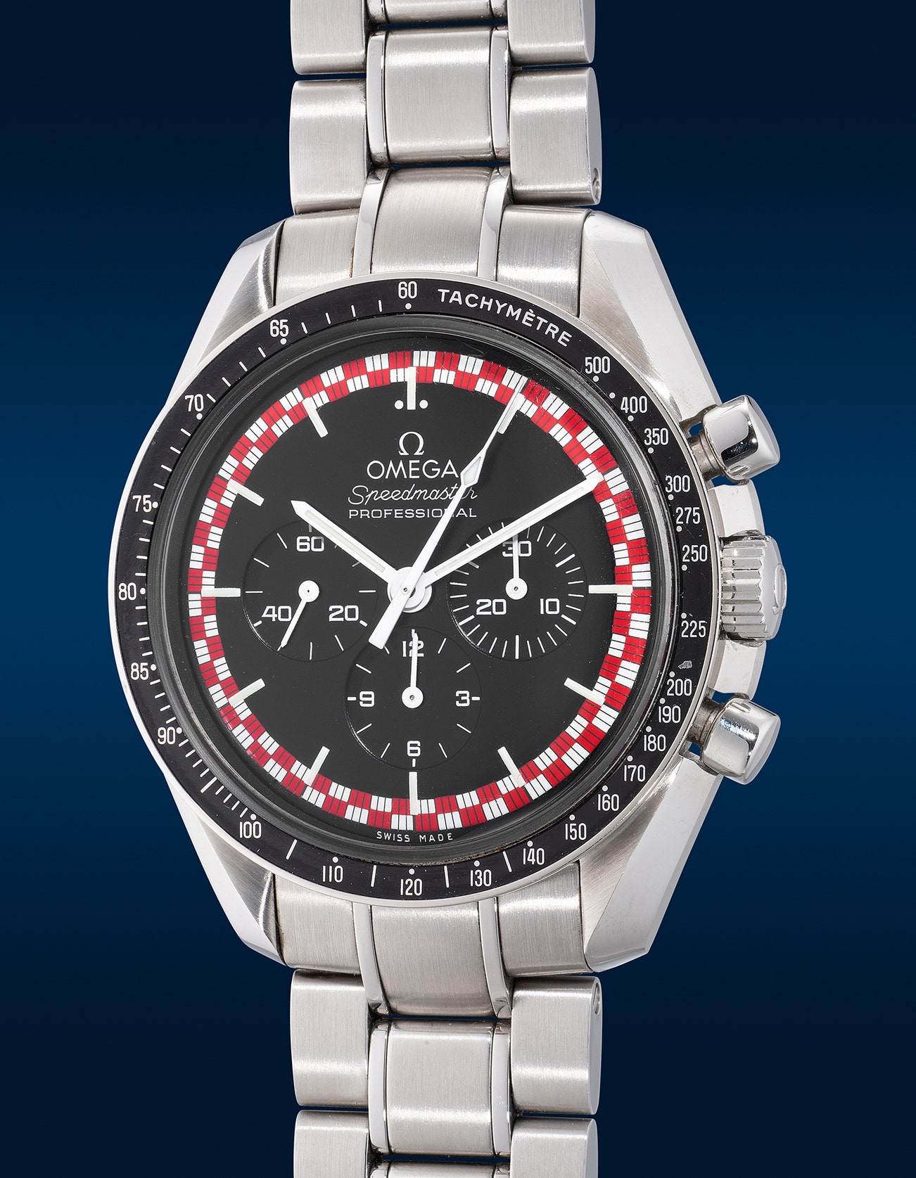 - One of the most sought-after and controversial Speedmaster models at its launch, it was clear that Omega marketed the model as a Speedmaster Racing. Enthusiasts soon probed that the watch maybe Omega’s discreet hint of the collaboration between the firm and the famed Cartoon “The Adventures of Tintin”. Declining the speculation from the community once again due to copyright issues, it was clear that the red and white “racing” dial was the exact reflection of Tintin’s rocket, where the character used to travel to the moon in the cartoon by Belgian cartoonist Georges Remi, also known as, Hergé. Published in the early 1950s, “Destination Moon” was produced following an extensive research by Hergé of the possibility of human space travel.