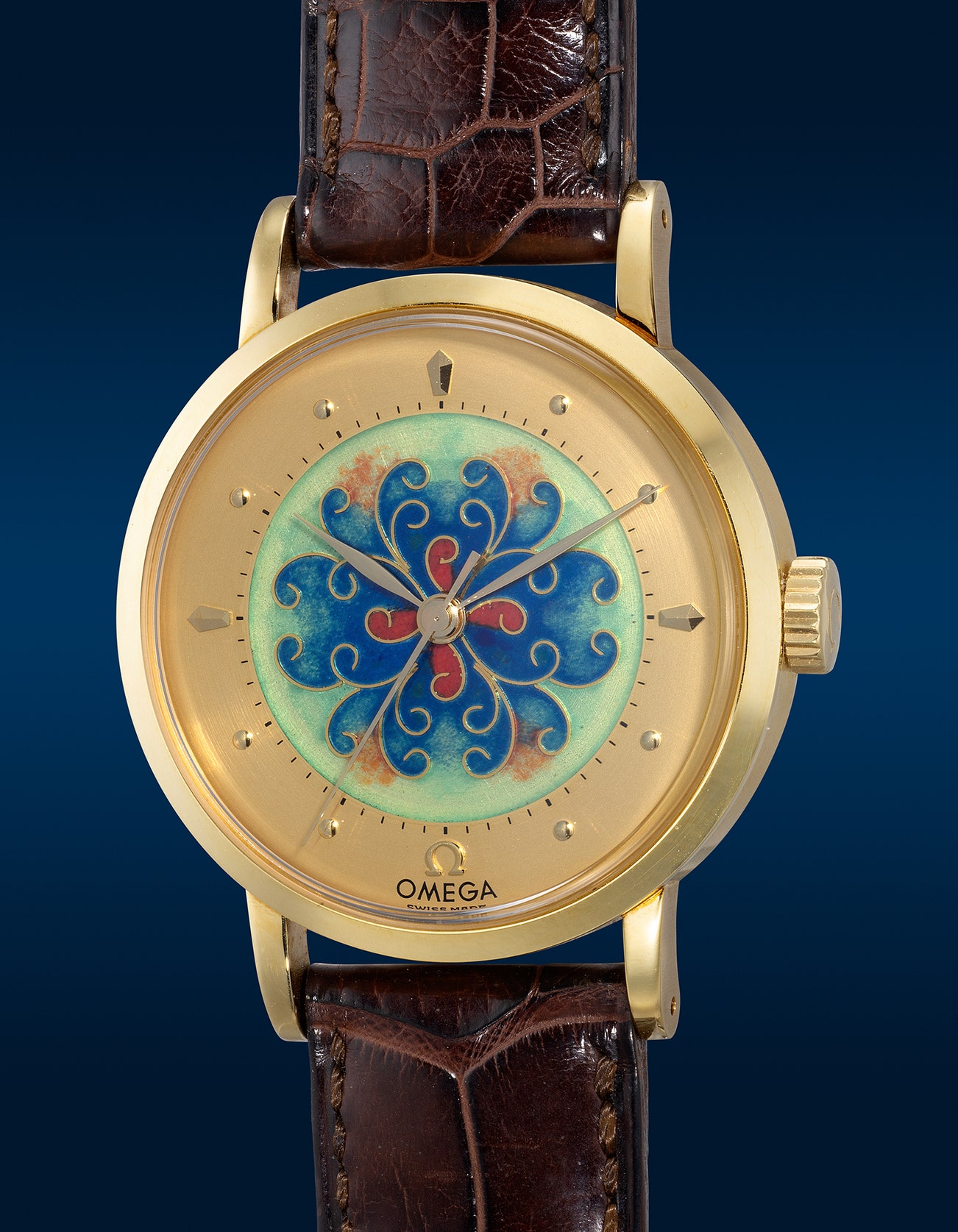 A rare, attractive and well-preserved limited edition yellow gold wristwatch with cloisonné enamel dial, center seconds and presentation box, numbered 27 of a limited edition of 100 pieces made to commemorate Omega’s 100th anniversary