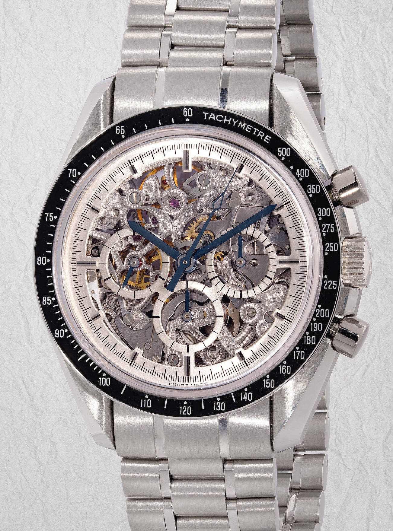 An exceptionally well-preserved, highly rare and attractive limited edition platinum skeletonized chronograph wristwatch with bracelet, warranty and presentation box, numbered 31 of a limited edition of 50 pieces made to commemorate the 25th anniversary of Apollo XI