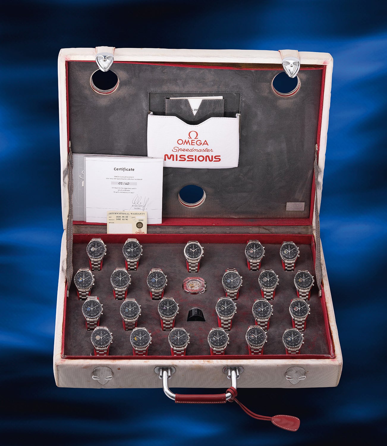 A rare and exceptional limited edition set of 23 stainless steel chronograph wristwatches with plastic encased movement, space suit valise and warranty, made to commemorate the Speedmaster Professional’s 40th anniversary, numbered 2 of a limited edition of 40 sets