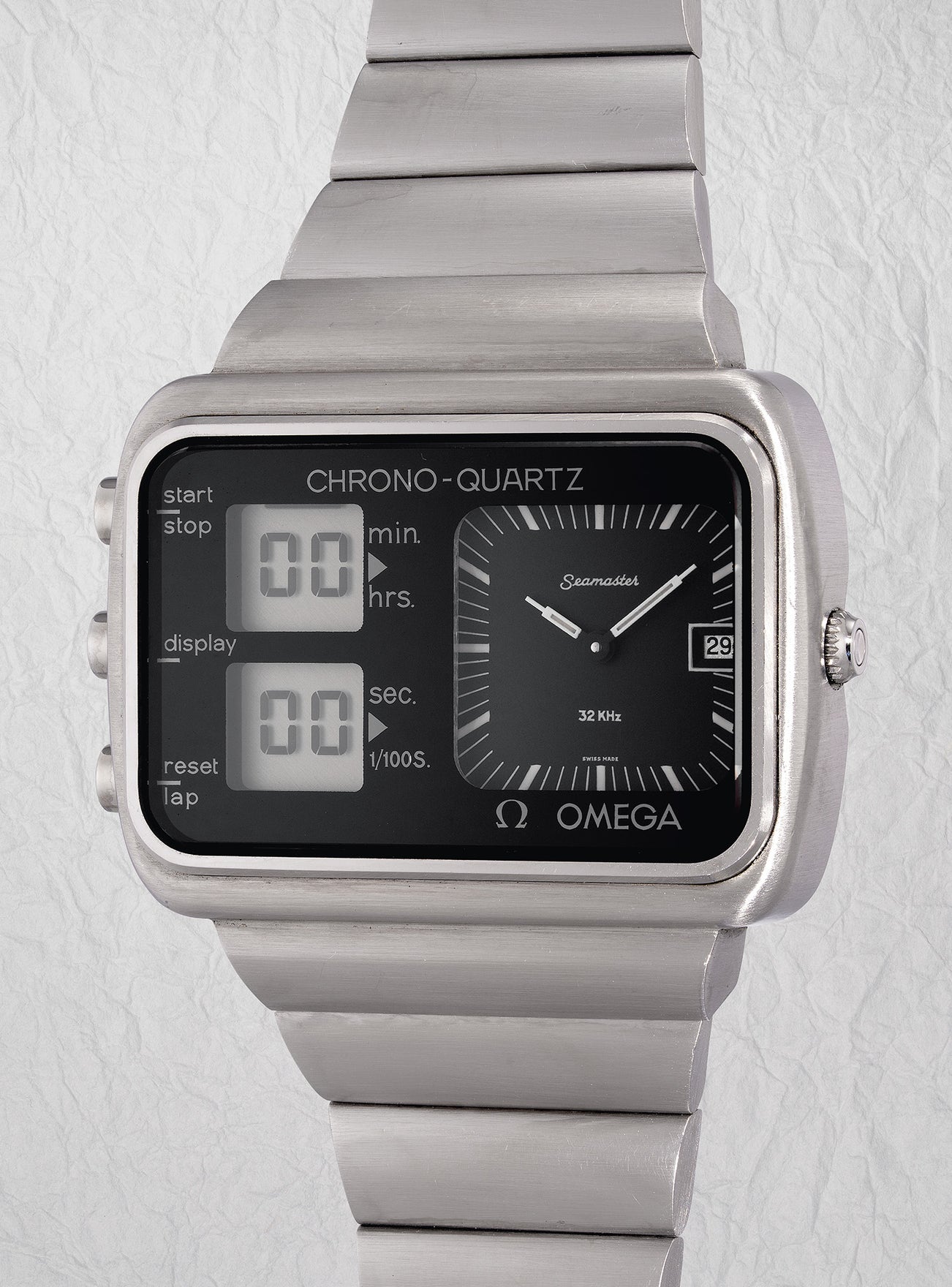 A highly rare and historically important rectangular stainless steel quartz-chronograph wristwatch with 1/100 seconds, date, analogue and digital display, integrated bracelet and presentation box, presented to Astronaut Charlie Duke for the Montreal Olympics games in 1976