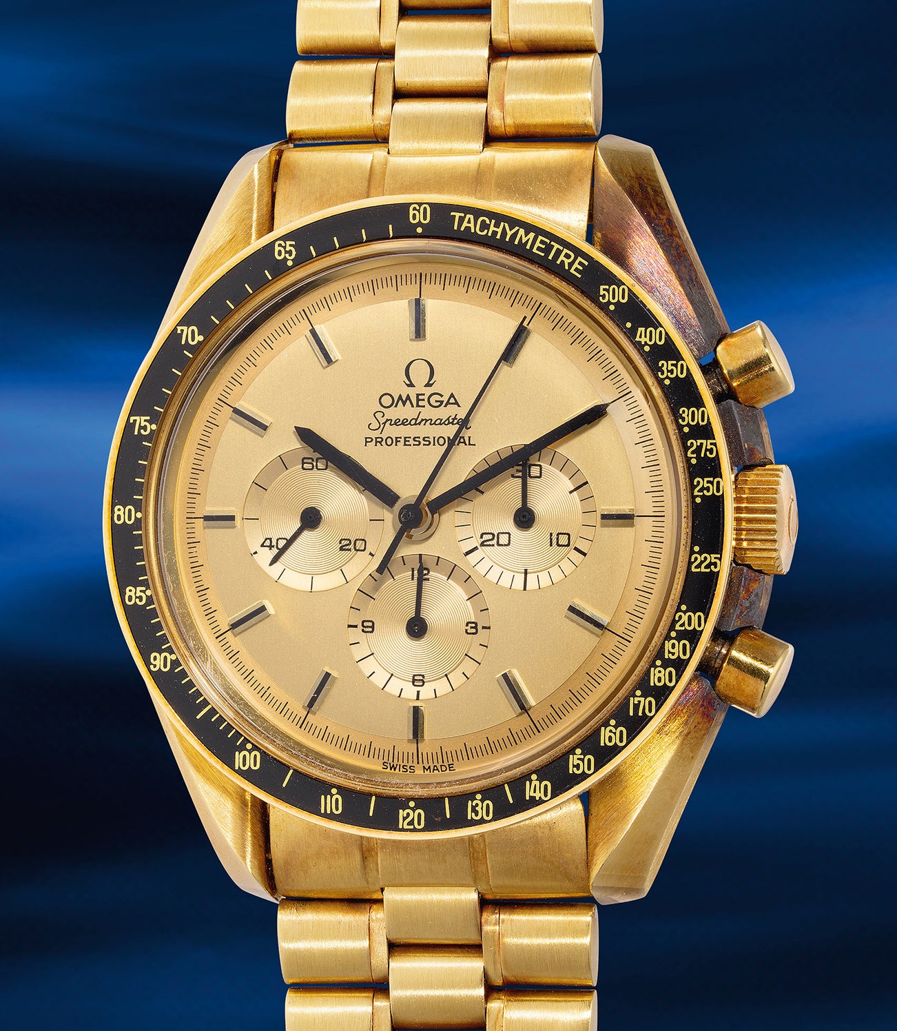 The caseback engraving proudly proclaims the model's lunar legacy and it is also the first Speedmaster with a display caseback. Within lies Omega's renowned manual-wind cal. 861 L, viewable through the sapphire crystal. The sleek yellow gold dial, free of luminous accents, pairs perfectly with applied black and gold indexes.