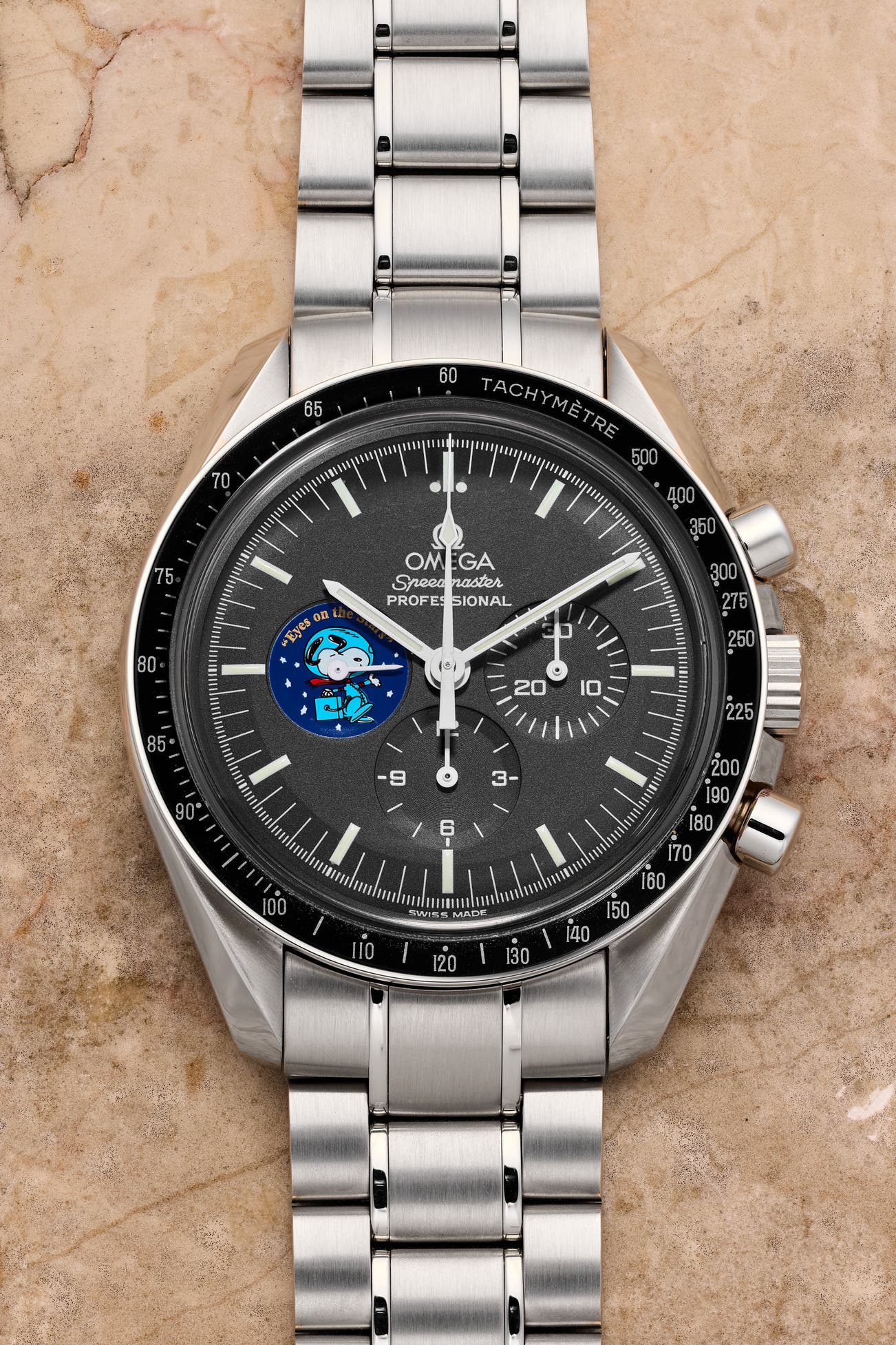 • Over the last five decades, Omega has celebrated this important award with the first Speedmaster Professional “Snoopy Award”, like the present watch, released in 2003 commemorating Omega receiving the award for the Apollo 13 mission. The 42mm diameter case is highlighted with “Snoopy” on the small subsidiary dial at 9 o’clock, and a caseback with engraved “Silver Snoopy Award” medallion with the words “Eyes on the Stars”. The watch was released in a limited edition of 5441 timepieces based on the duration of the Apollo 13 mission at 142 hours, 54 minutes, and 41 seconds
