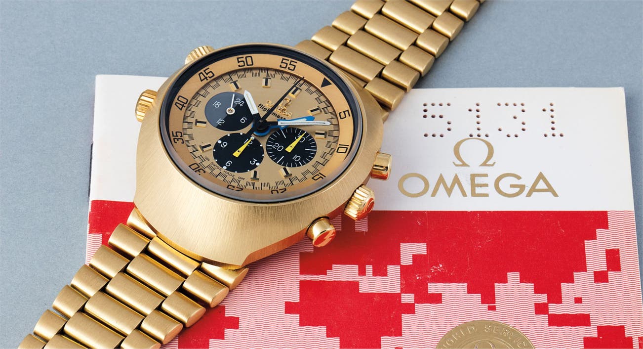 The first example of the "De Luxe" series with gold bracelet, weighing an impressive 220 grams, was sold to King Hussein of Jordan. The present "Flight Master" is a particularly interesting example, as it is not only in excellent condition, but also features two elements that, to the best of our knowledge, have not yet been seen as such at an auction; on one hand the yellow hands which we understand were supplied on Flight Masters used by pilots. The yellow cadmium coated hands were particularly well legible in aircraft cockpits lit with infra-red lights. Another custom feature on the present watch is an over proportioned O-ring, making sure that the crystal would not pop out even in situations of sudden decompression in the cockpit.