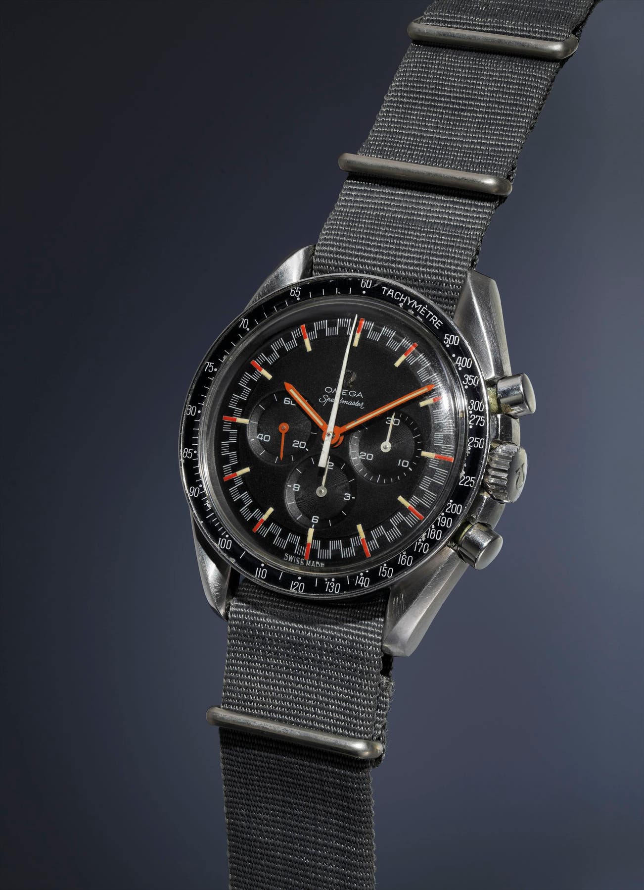 What makes the present lot exceptional is the utterly rare “exotic”, matte black dial known as the “racing dial”. This configuration does not appear often, and it is believed that there are as few as ten examples known to the market. It carries a “two liner” with Omega and Speedmaster only, and omits the designation Professional as found on later examples. Also, the T does not flank the Swiss Made script at the bottom of the dial for Tritium, another indication of its early origins. A nearly identical example is shown in the Moonwatch Only book. The colors of the dial and hands are vibrant, and together with the well-preserved condition of the case, make it an exciting addition to any collection of rare sports watches.