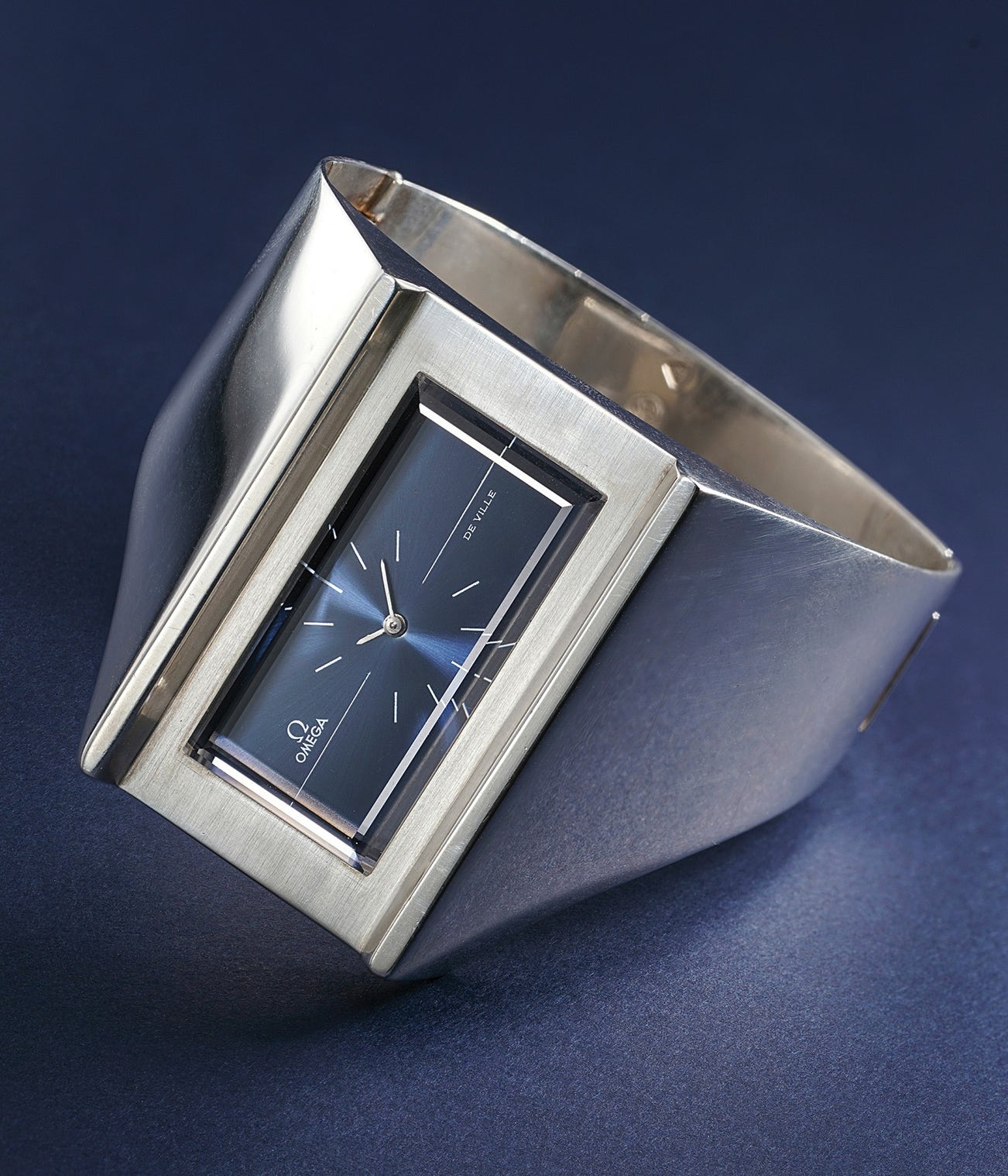 An extremely rare and historically interesting asymmetric bracelet watch with blue dial