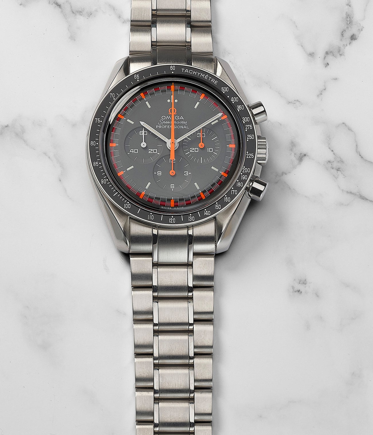 In 2004, Omega reintroduced the “Racing” dial and was made only for the Japanese market referenced 3750.40. With the design of the dial very similar to examples from the 1960s, the new model featured a crayon grey dial with red, white and orange accents. Upgraded and an understated feature, the orange accents on the dial were applied with luminous material, and when one sheds UV light on the dial, the orange accents display a neon glow. Adapting essentially the same concept as the original models, the tri-colored dial provides an enhanced legibility for wearers. Contrasting beautifully against a crayon grey dial, the Speedmaster “Racing” Japan is without a doubt a wonderfully executed iteration of the much loved Speedmaster “Racing” model. It is believed that only 2,004 examples were produced.