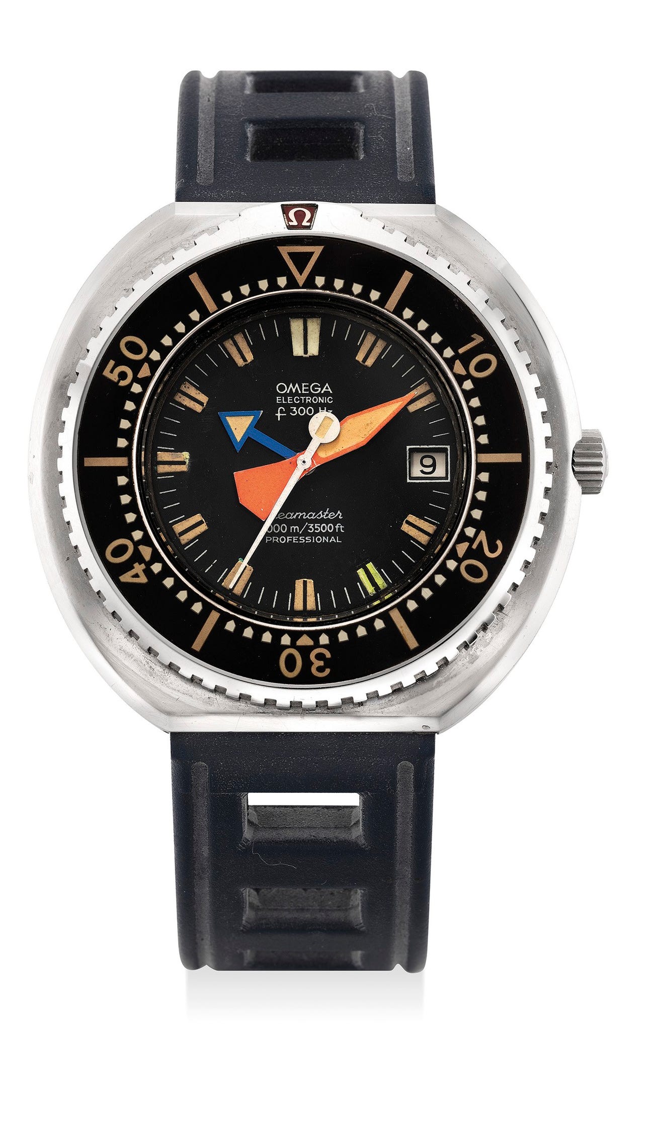 In excellent original condition, the present watch has a big look and feel. From 1974, this extreme rare watch is a prototype which was destined for the American firm Underwater Contractors who were to test the model for saturation dive condition. This watch lacks a screw-down crown and therefore may not actually have been use in field tests, but was a working model. The dial is an interesting study as it was made by the Omega “Test & Prototyping” department. The green five plot may be a repair, or a possible requirement for the watch, while in a dive saturation. It has been described as a “pre-series” and is probably an attempt by Omega to find the right look and feel for the dial. This watch is extremely rare and with it interesting historical background makes a wonderful addition to any collection. It is a synthesis of all the designs and experiments that lead to some of the most important dive watches of the 20th century.