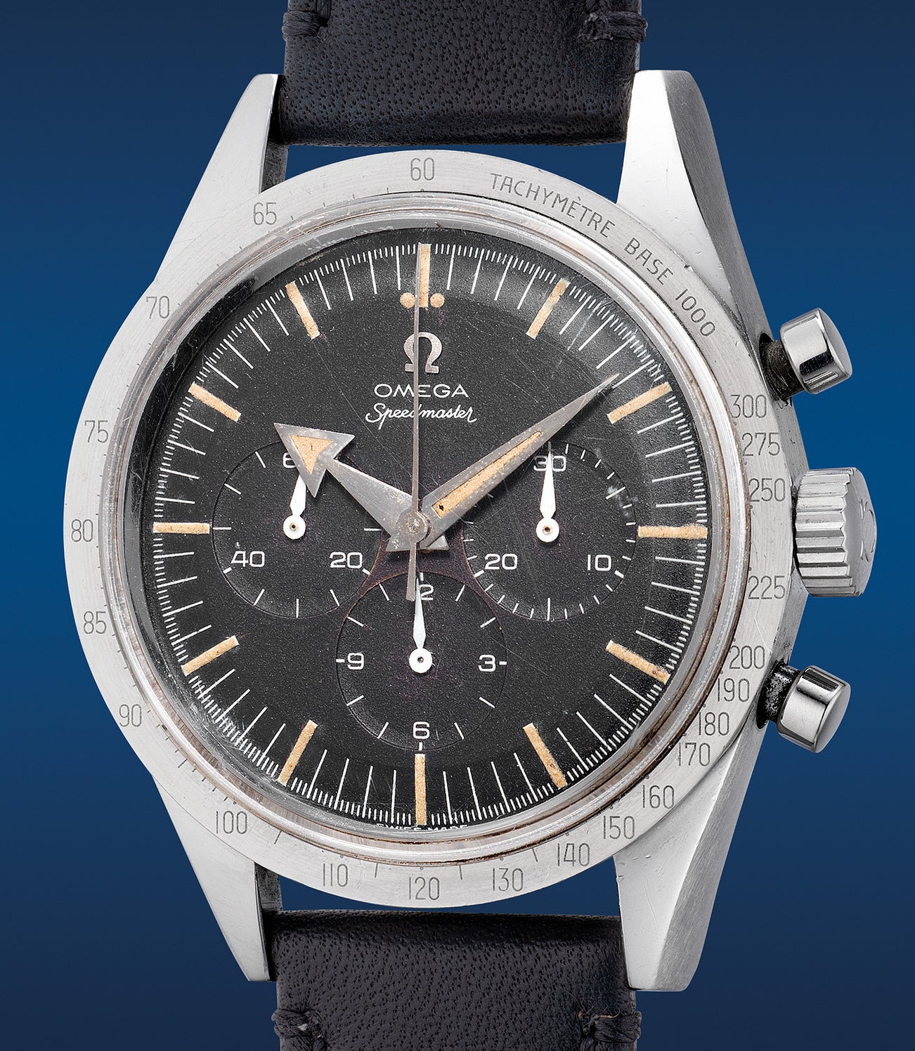 The present lot, a reference 2915-1, belongs to the first generation of Speedmasters, fitted with all of its original parts exhibiting all of the early details collectors adore. The first is the rare Base 1000 metal bezel with the iconic “flat top 3” followed by the dial configuration. The Omega signature features the iconic "Oval" O and the caseback bears a crisp “Speedmaster” engraving on the edge of the caseback. A great opportunity for all Speedy collectors.