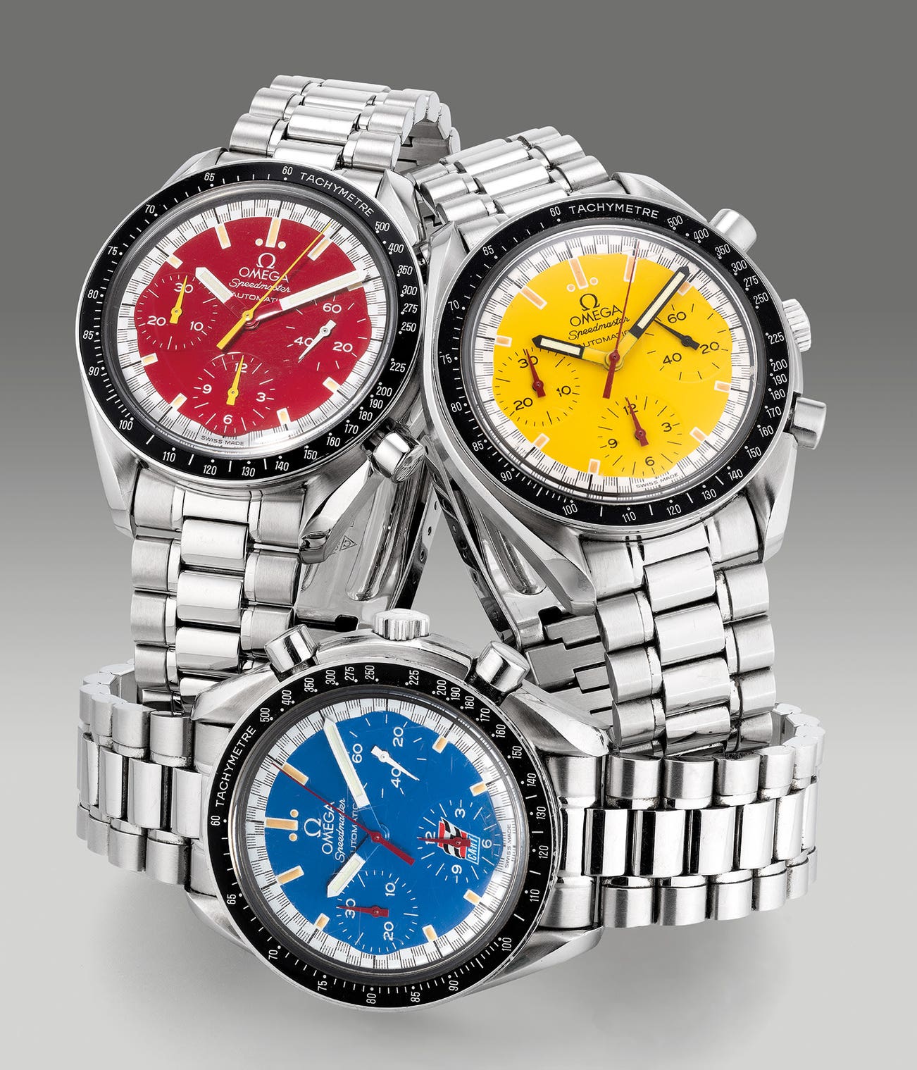 Presented in a bespoke tyre presentation box inspired by F1 cars and the complete full set accessories. This is an absolute delightful trio for Speedmaster collectors with a passion for the fast and furious to add to their collection.