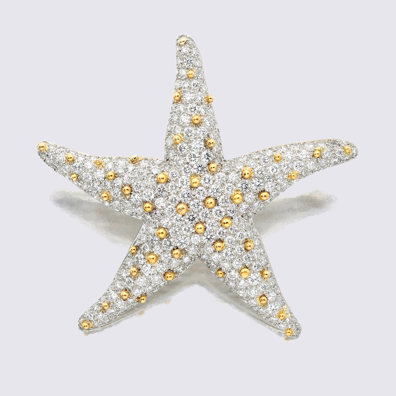 Designed as a starfish, pavé-set with brilliant-cut diamonds, accented with gold boules, mounted in platinum and 18K yellow gold, length measuring approximately 2 1/4 inches, signed Oscar Heyman and Brothers, numbered.