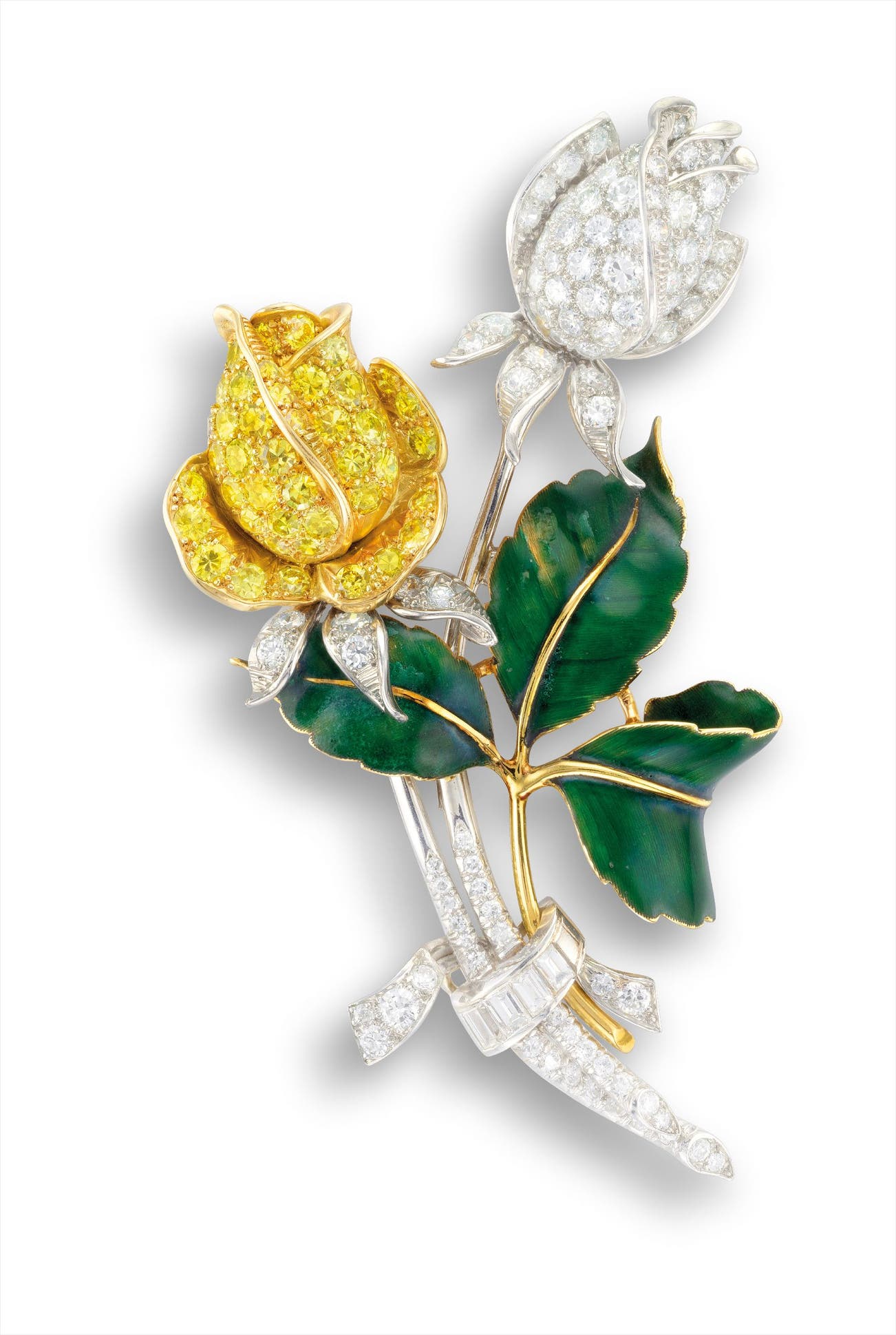 A Diamond, Yellow Diamond and Green Enamel 'Rosebud' Brooch, Oscar Heyman & Brothers